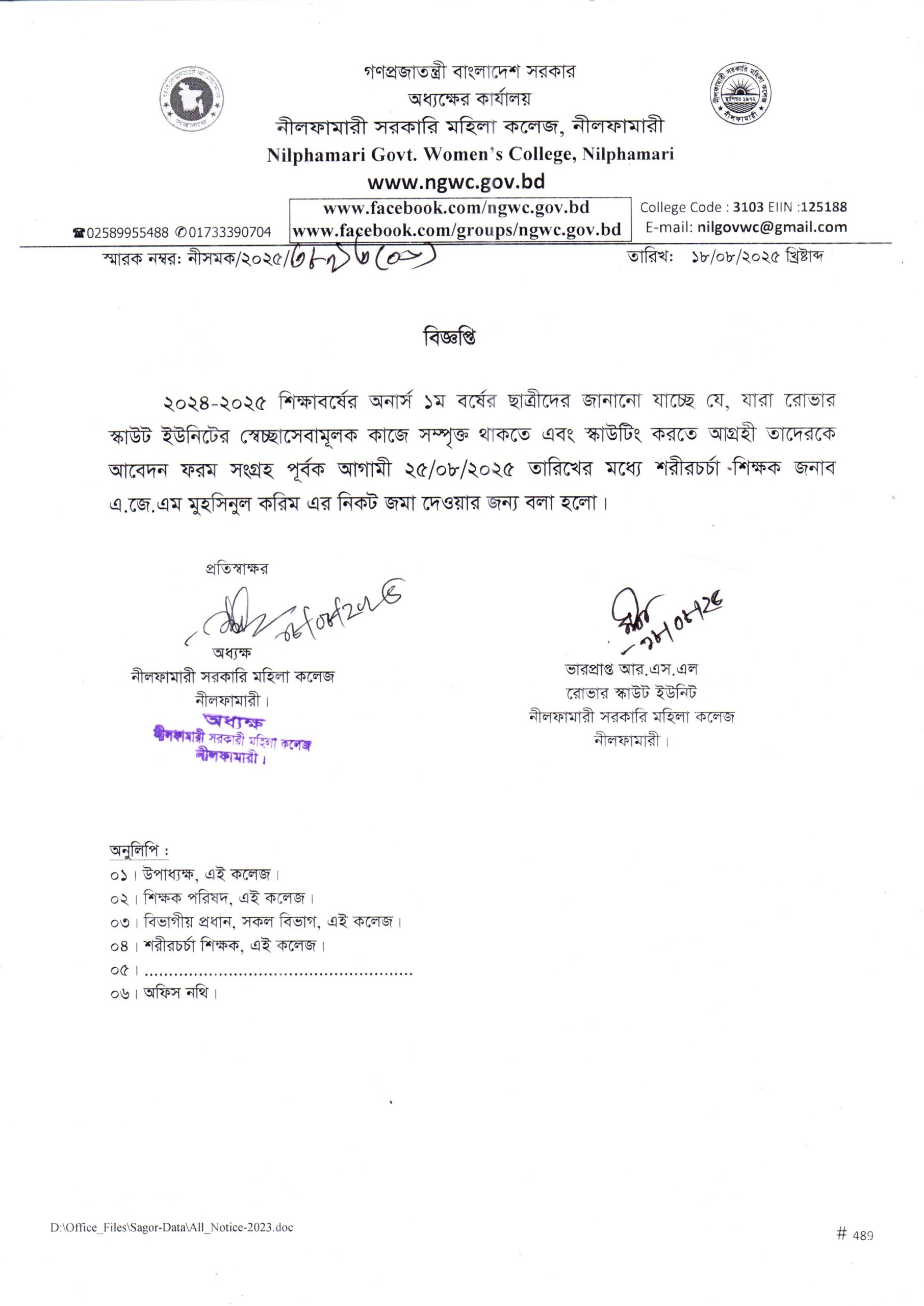 **অনার্স ১ম বর্ষ ছাত্রীদের মধ্যে রোভার স্কাউট হতে আগ্রহীদের কাছ থেকে আবেদন ফরম আহ্বান**