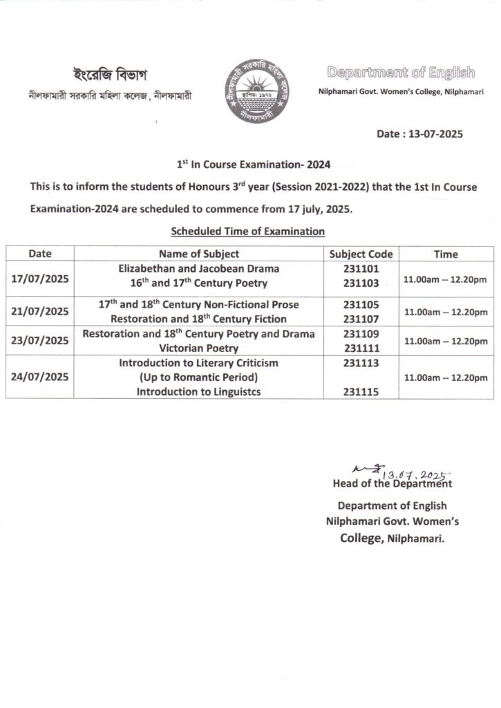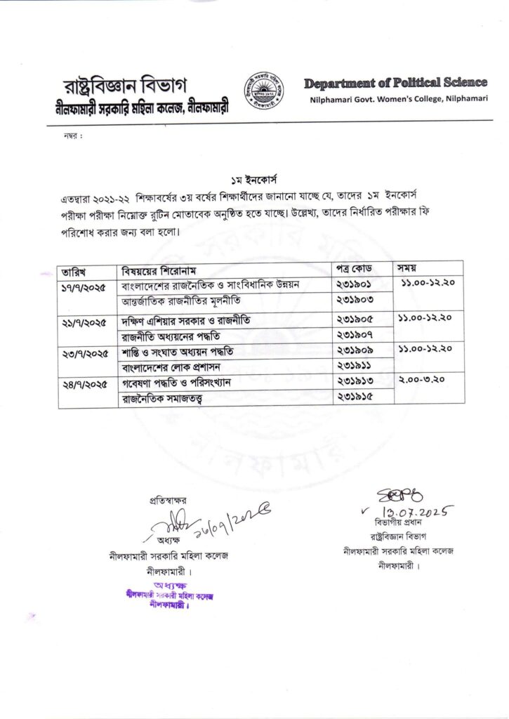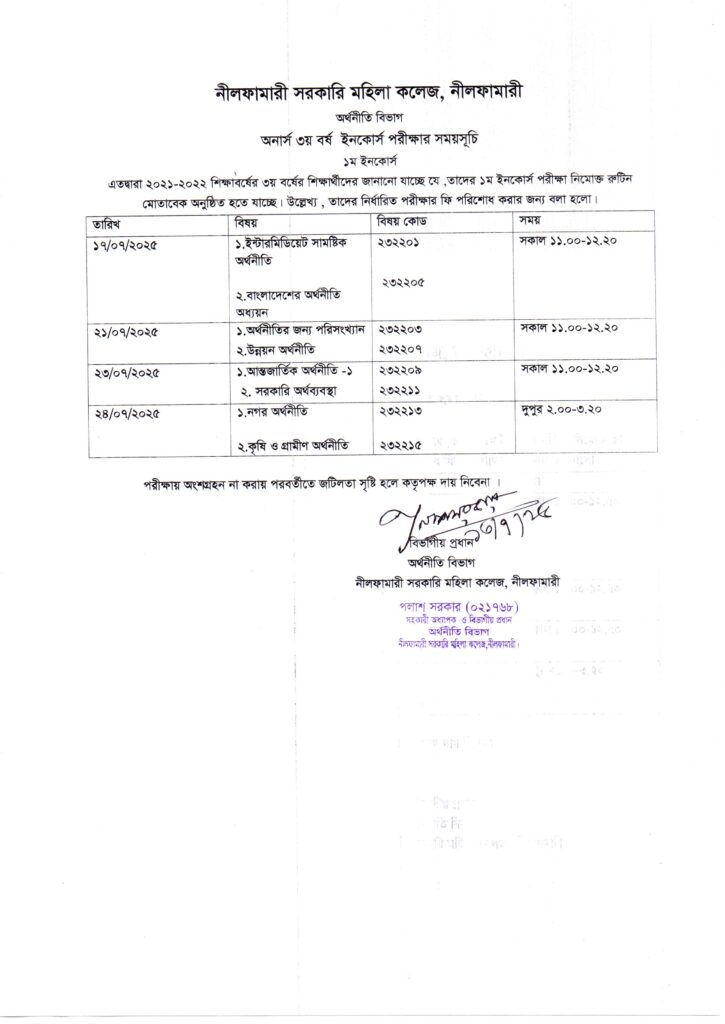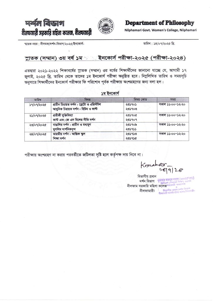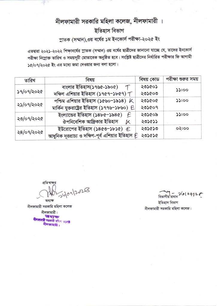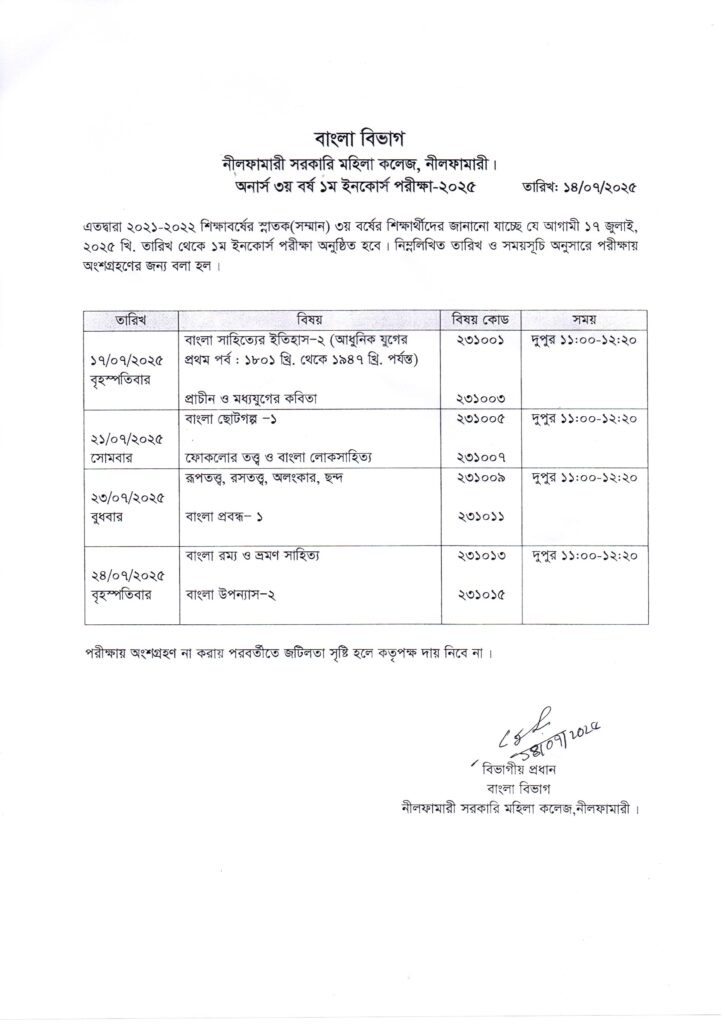 ** অনার্স ৩য় বর্ষ ইনকোর্স পরীক্ষার রুটিন**