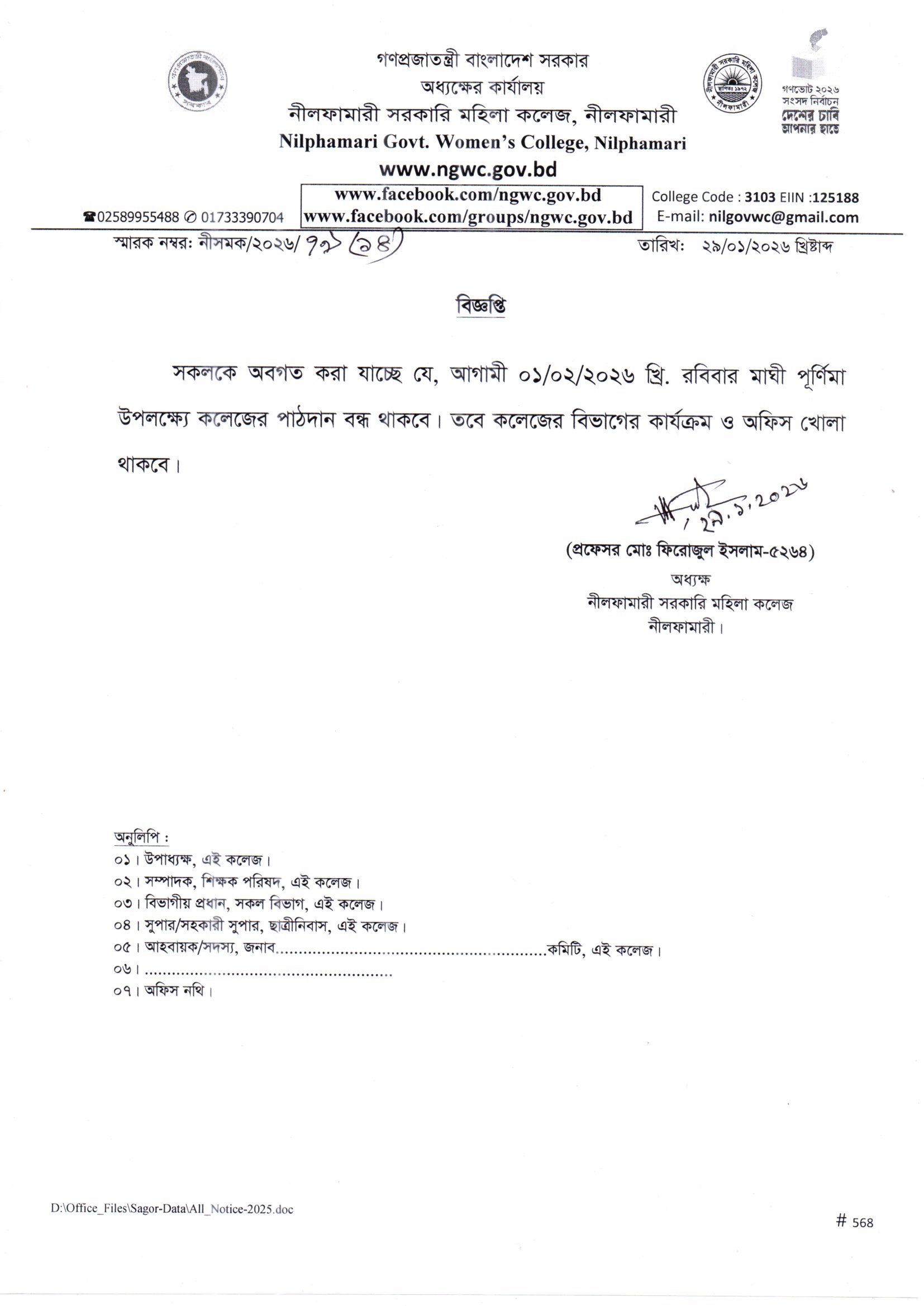 **আগামী ০১/০২/২০২৬ খ্রি. রবিবার মাঘী পূর্ণিমা উপলক্ষ্যে কলেজের পাঠদান বন্ধ থাকবে**