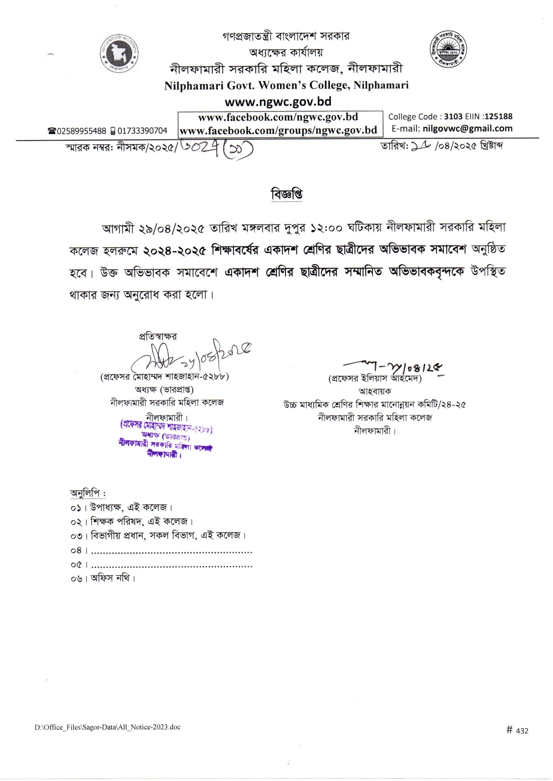 আগামী ২৯/০৪/২০২৪ তারিখ মঙ্গলবার দুপুর ১২:০০ ঘটিকায় ২০২৪-২০২৫ শিক্ষাবর্ষের একাদশ শ্রেণির ছাত্রীদের অভিভাবক সমাবেশ ।