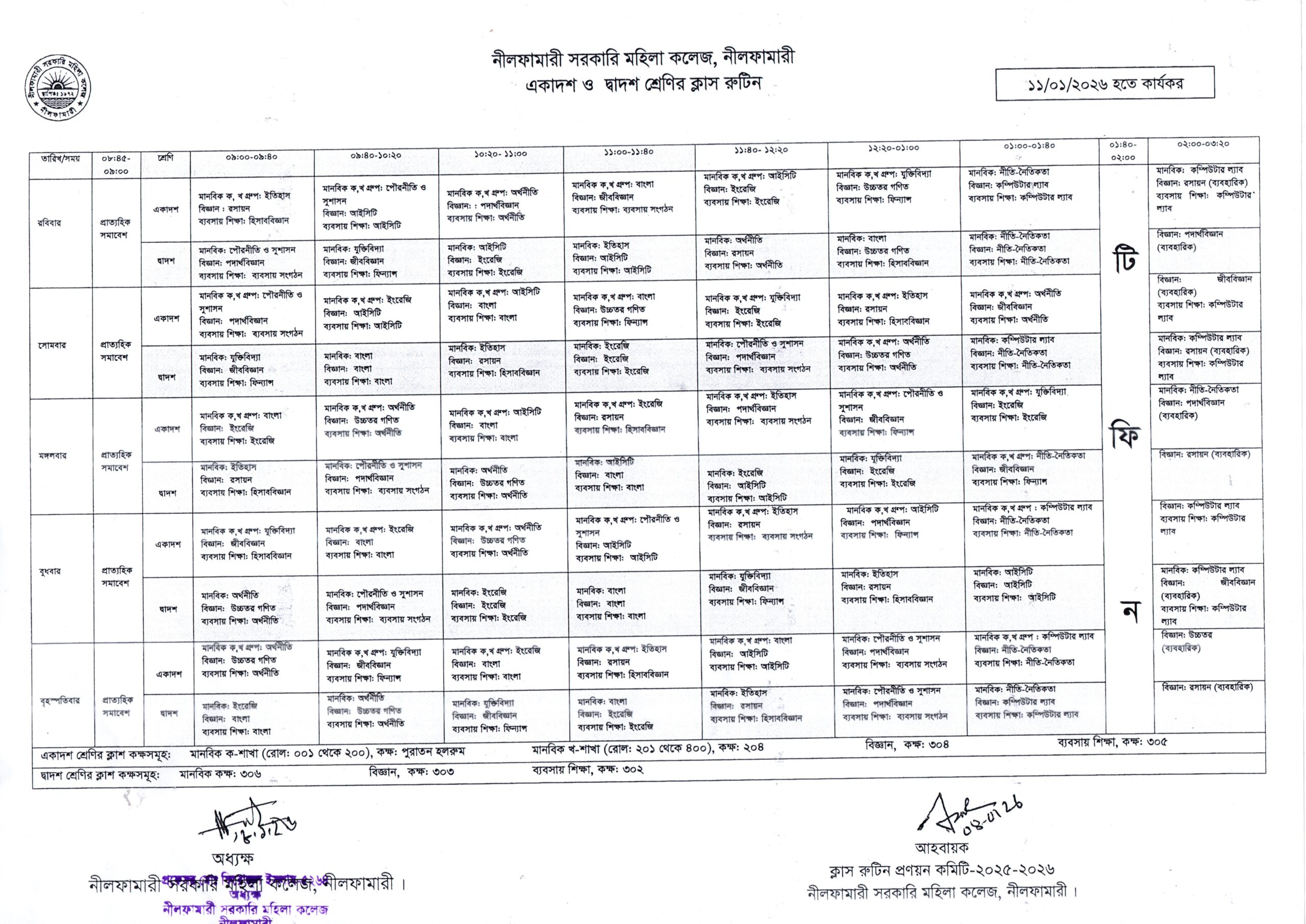 *একাদশ ও দ্বাদশ শ্রেণির ক্লাস রুটিন (সংশোধিত)**