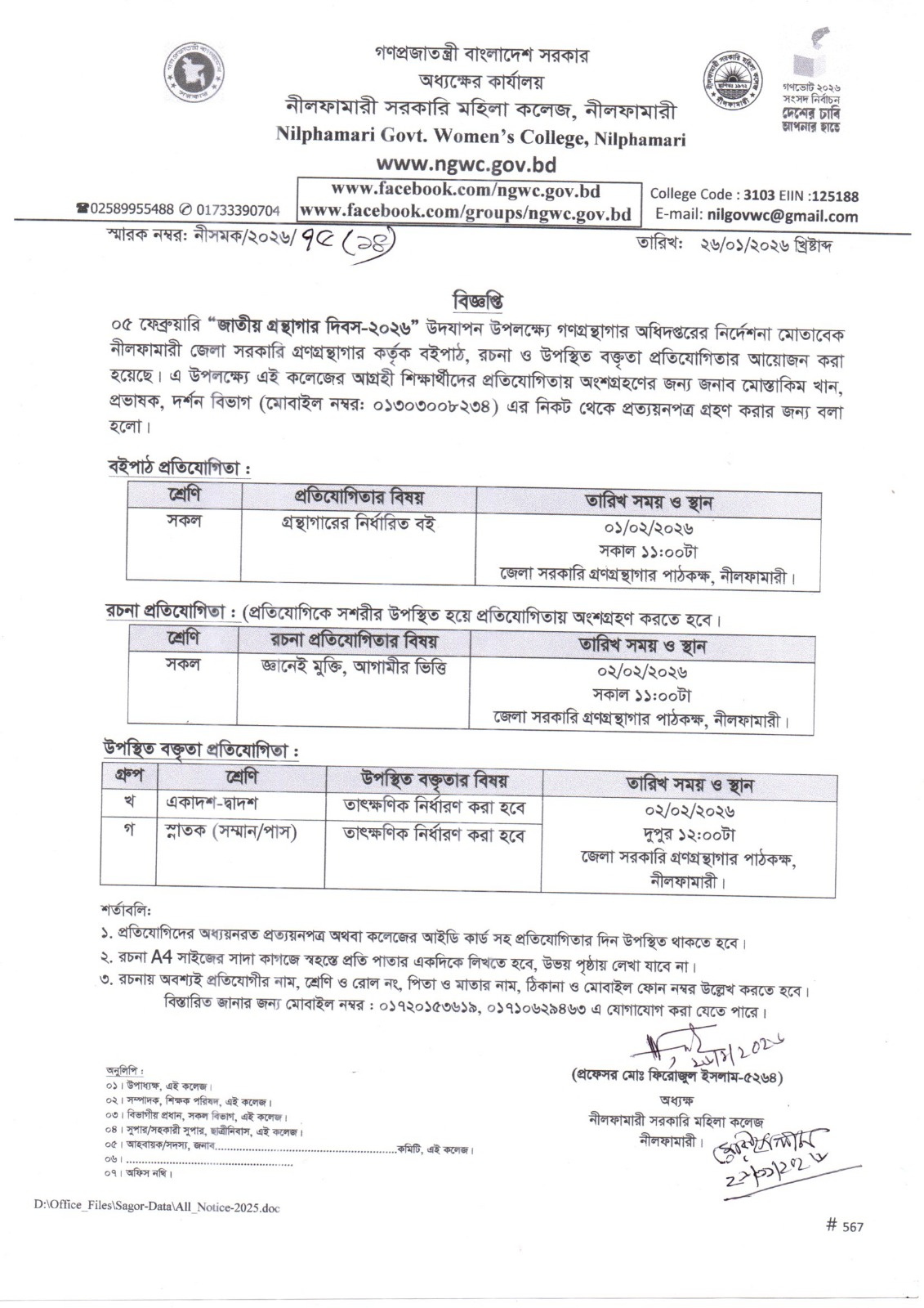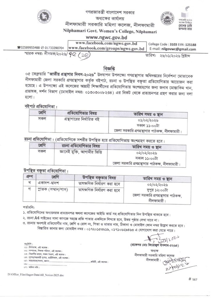 জাতীয় গ্রন্থাগার দিবস-২০২৬ উপলক্ষ্যে প্রতিযোগিতা