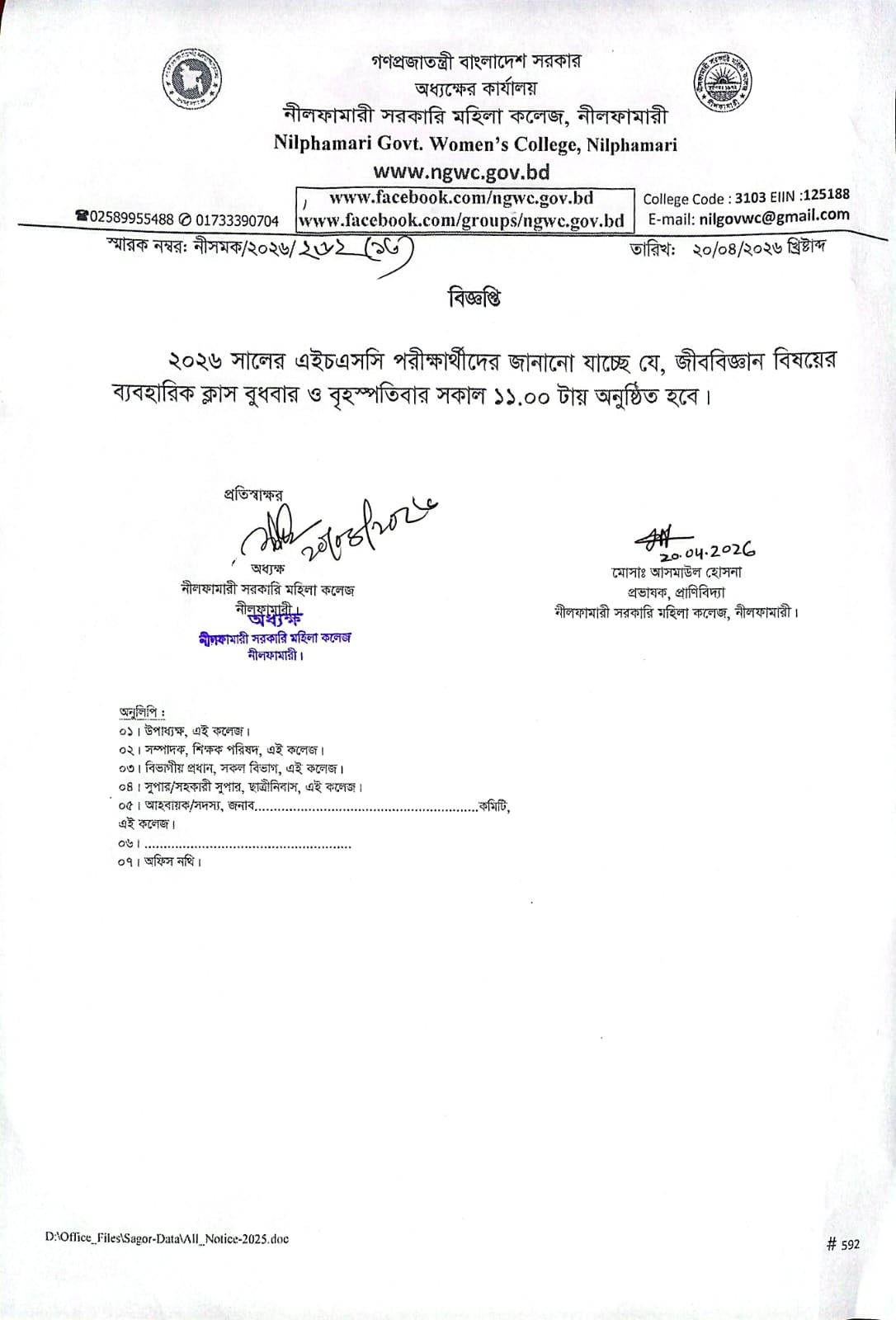 জীববিজ্ঞান বিষয়ের ব্যবহারিক ক্লাস সংক্রান্ত