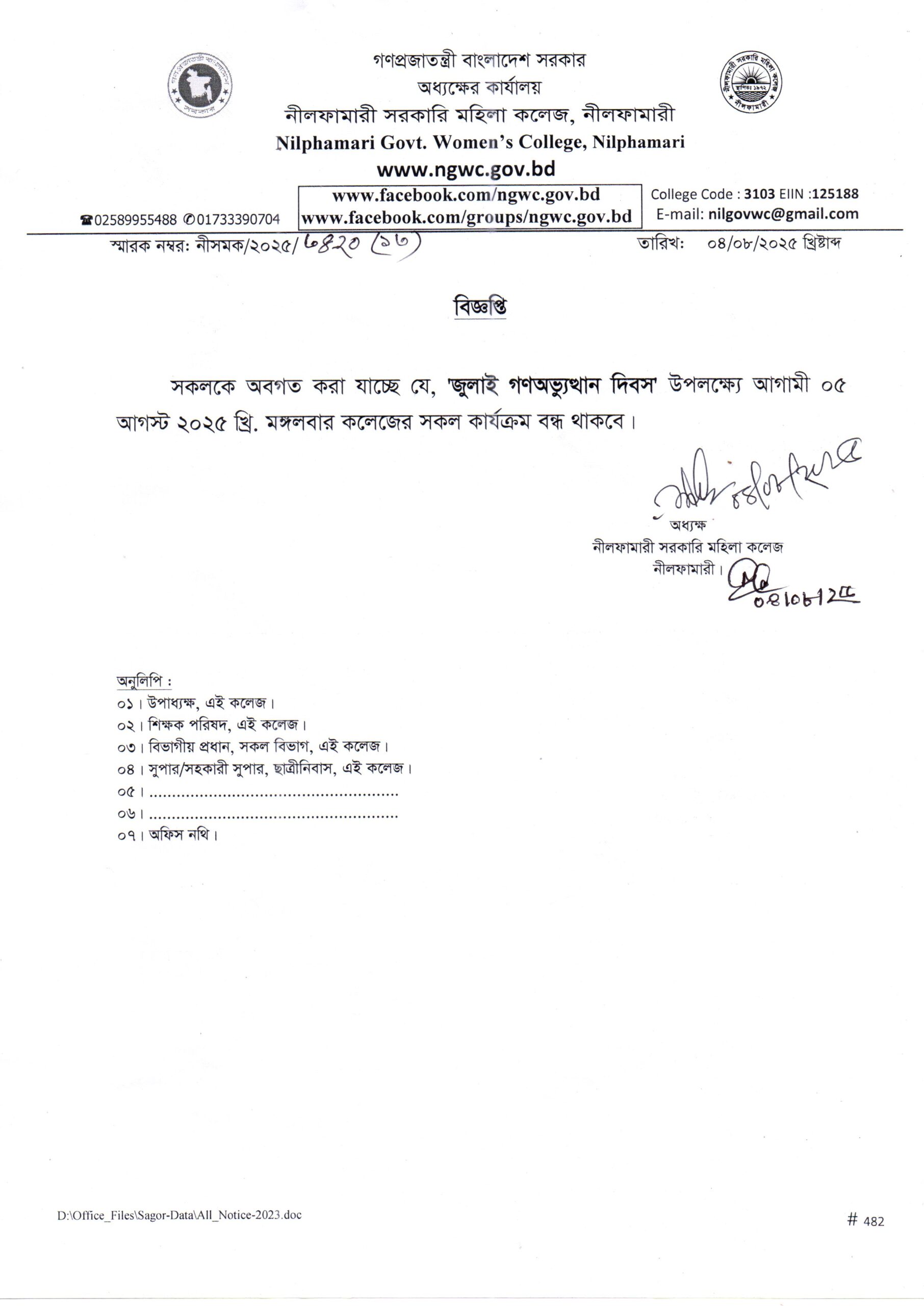 ** ‘জুলাই গণঅভ্যুত্থান দিবস’ উপলক্ষ্যে ৫ আগস্ট ২০২৫ কলেজের সকল কার্যক্রম বন্ধ থাকবে**