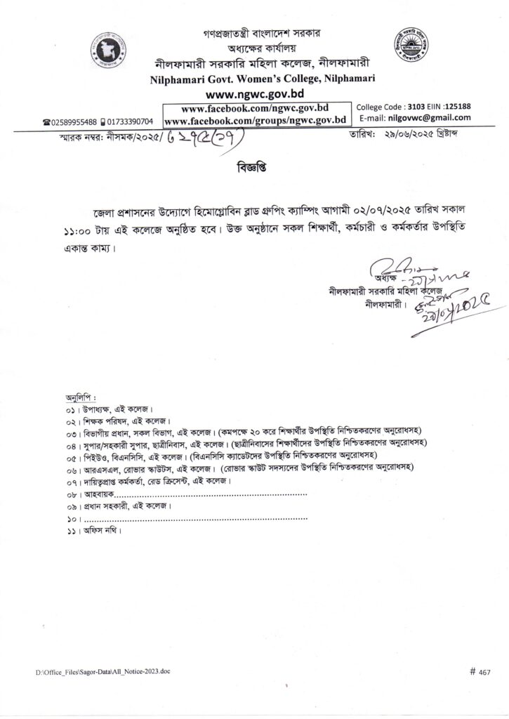 **জেলা প্রশাসনের উদ্যোগে হিমোগ্লোবিন ব্লাড গ্রুপিং ক্যাম্পিং আগামী ০২/০৬/২০২৫তারিখ সকাল ১১:০০ টায় কলেজে অনুষ্ঠিত হবে**