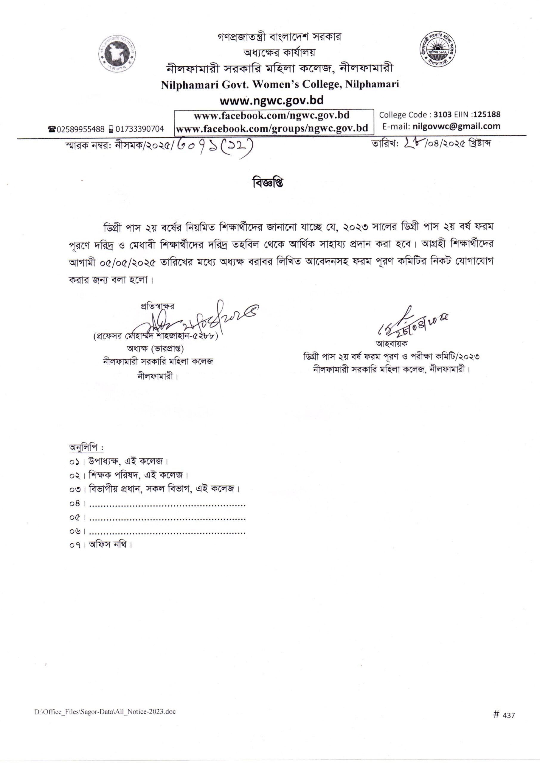 ডিগ্রী পাস ২য় বর্ষের নিয়মিত শিক্ষার্থীদের ফরম পূরণে দরিদ্র ও মেধাবী শিক্ষার্থীদের দরিদ্র তহবিল থেকে আর্থিক সহায়তা