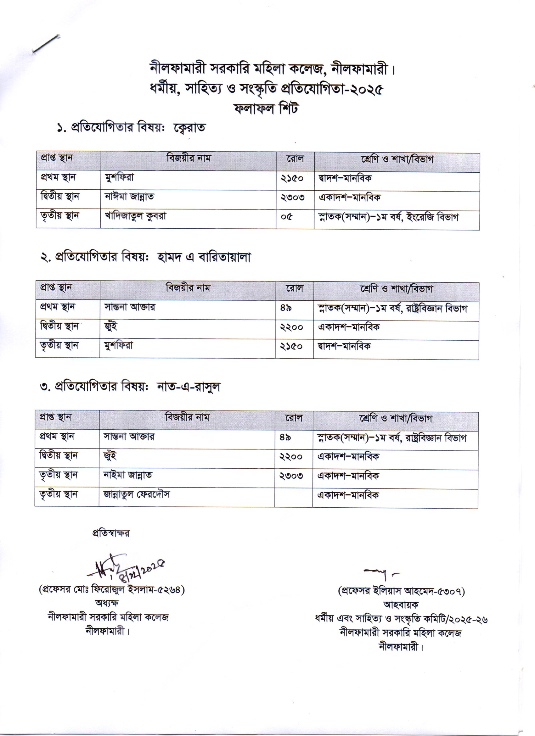 **‘ধর্মীয়, সাহিত্য ও সংস্কৃতি প্রতিযোগিতা-২০২৫’ এর ফলাফল**
