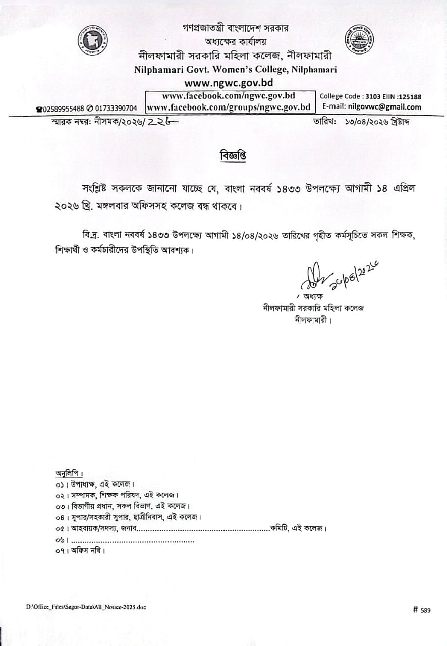 **বাংলা নববর্ষ ১৪৩৩ উপলক্ষ্যে আগামী ১৪ এপ্রিল ২০২৬ খ্রি. মঙ্গলবার অফিসসহ কলেজ বন্ধ থাকবে**
