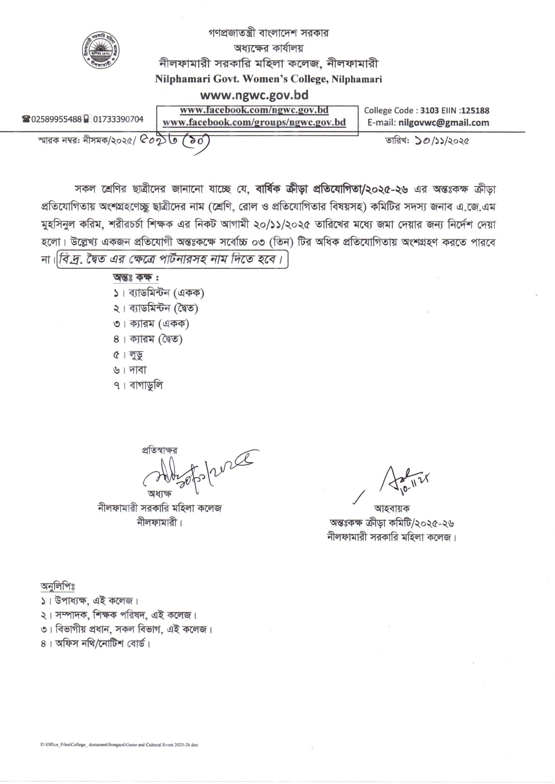 **‘বার্ষিক ক্রীড়া প্রতিযোগিতা/২০২৫-২০২৬’ অন্তঃকক্ষ ক্রীড়া প্রতিযোগিতায় বিভিন্ন ইভেন্ট এ অংশগ্রহণেচ্ছু ছাত্রীদের নাম জমা**