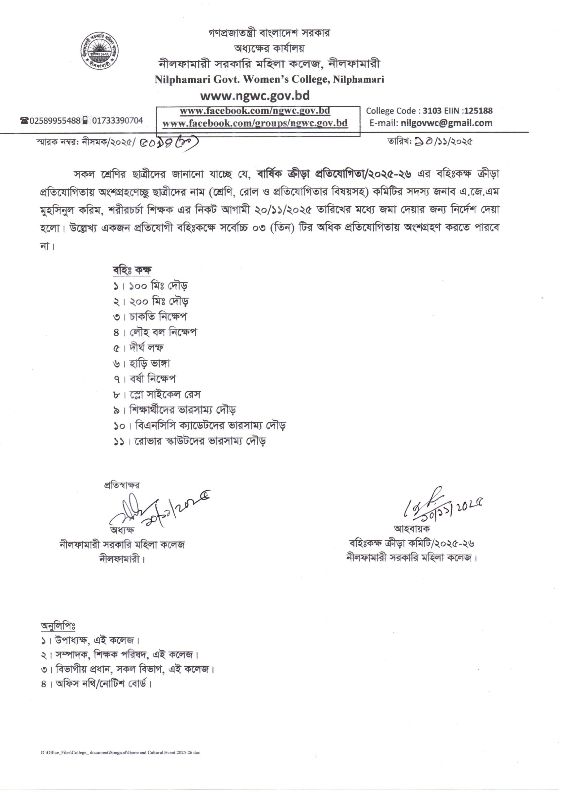 **বার্ষিক ক্রীড়া প্রতিযোগিতা/২০২৫-২০২৬ বহিঃকক্ষ ক্রীড়া প্রতিযোগিতায় বিভিন্ন ইভেন্ট এ অংশগ্রহণেচ্ছু ছাত্রীদের নাম জমা**
