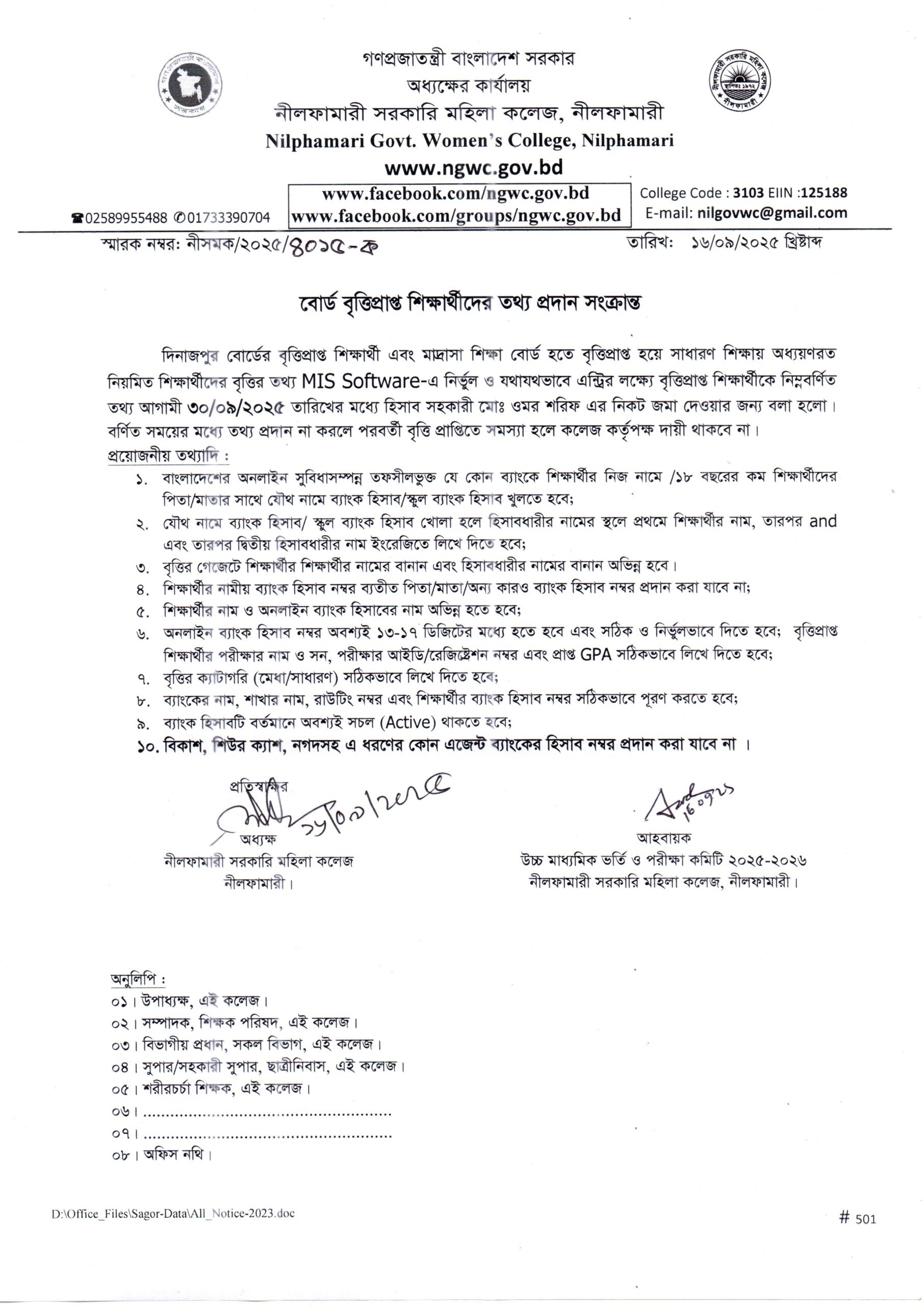 **বোর্ড বৃত্তিপ্রাপ্ত শিক্ষার্থীদের তথ্য প্রদান সংকান্ত**