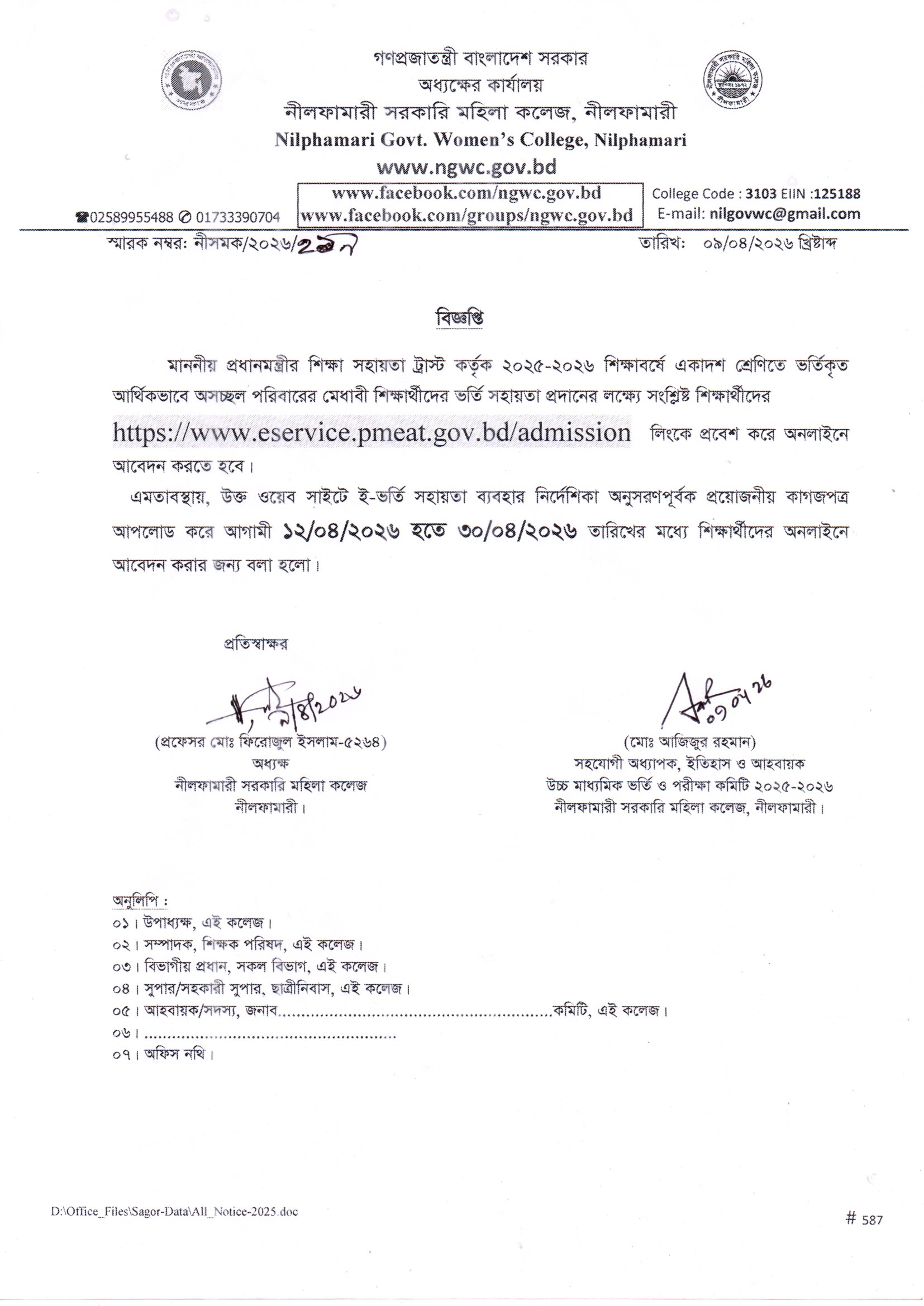 **মাননীয় প্রধানমন্ত্রীর শিক্ষা সহায়তা ট্রাস্ট কর্তৃক ২০২৫-২০২৬ শিক্ষাবর্ষে একাদশ শ্রেণিতে ভর্তিকৃত আর্থিকভাবে অসচ্ছল পরিবারের মেধাবী শিক্ষার্থীদের ভর্তি সহায়তা প্রদানের লক্ষ্যে অনলাইনে আবেদন
