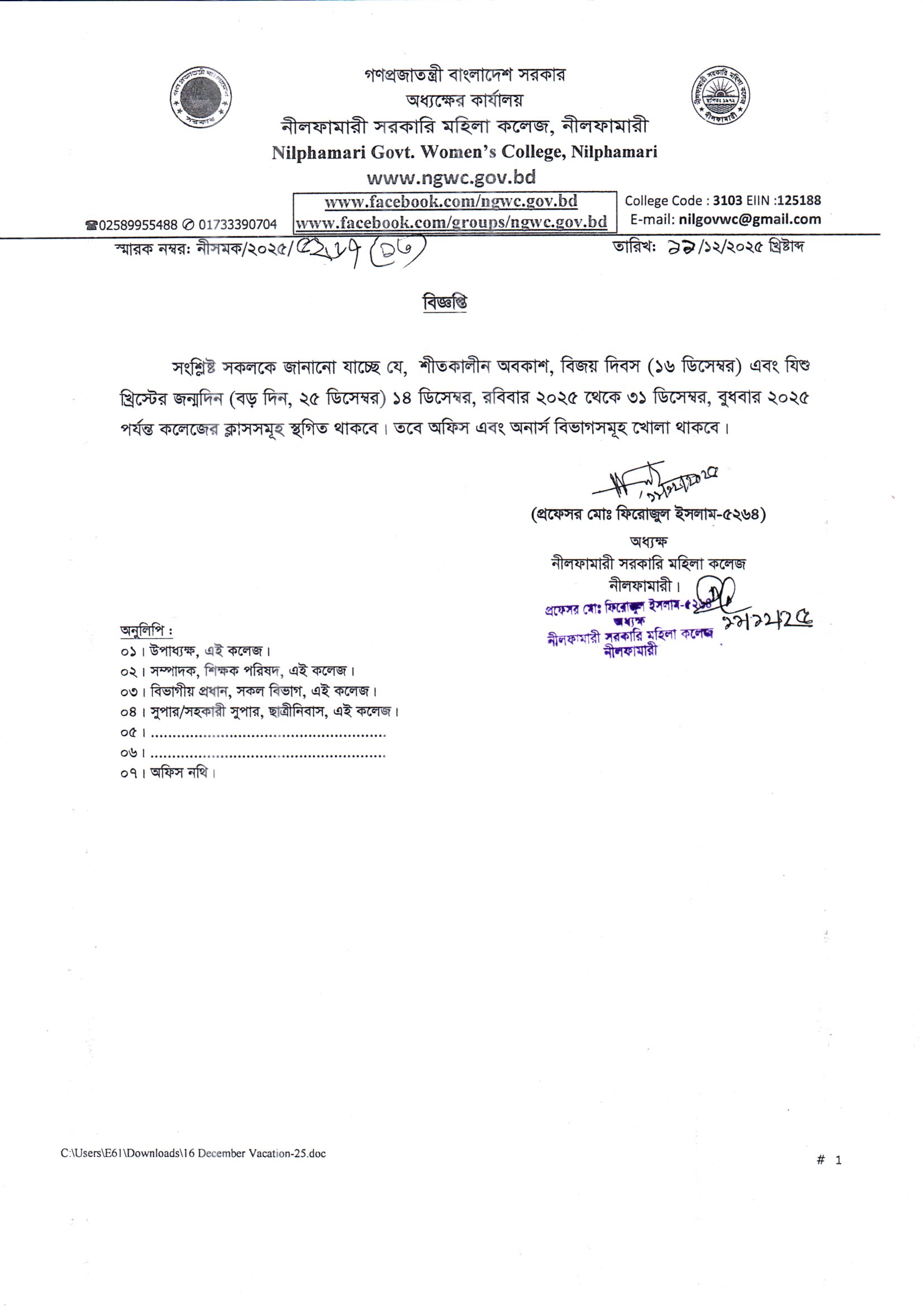 **শীতকালীন অবকাশ, বিজয় দিবস (১৬ ডিসেম্বর) এবং যিশু খ্রিস্টের জন্মদিন (বড় দিন, ২৫ ডিসেম্বর) ১৪ ডিসেম্বর, রবিবার ২০২৫ থেকে ৩১ ডিসেম্বর, বুধবার ২০২৫ পর্যন্ত কলেজের ক্লাসসমূহ স্থগিত থাকবে**