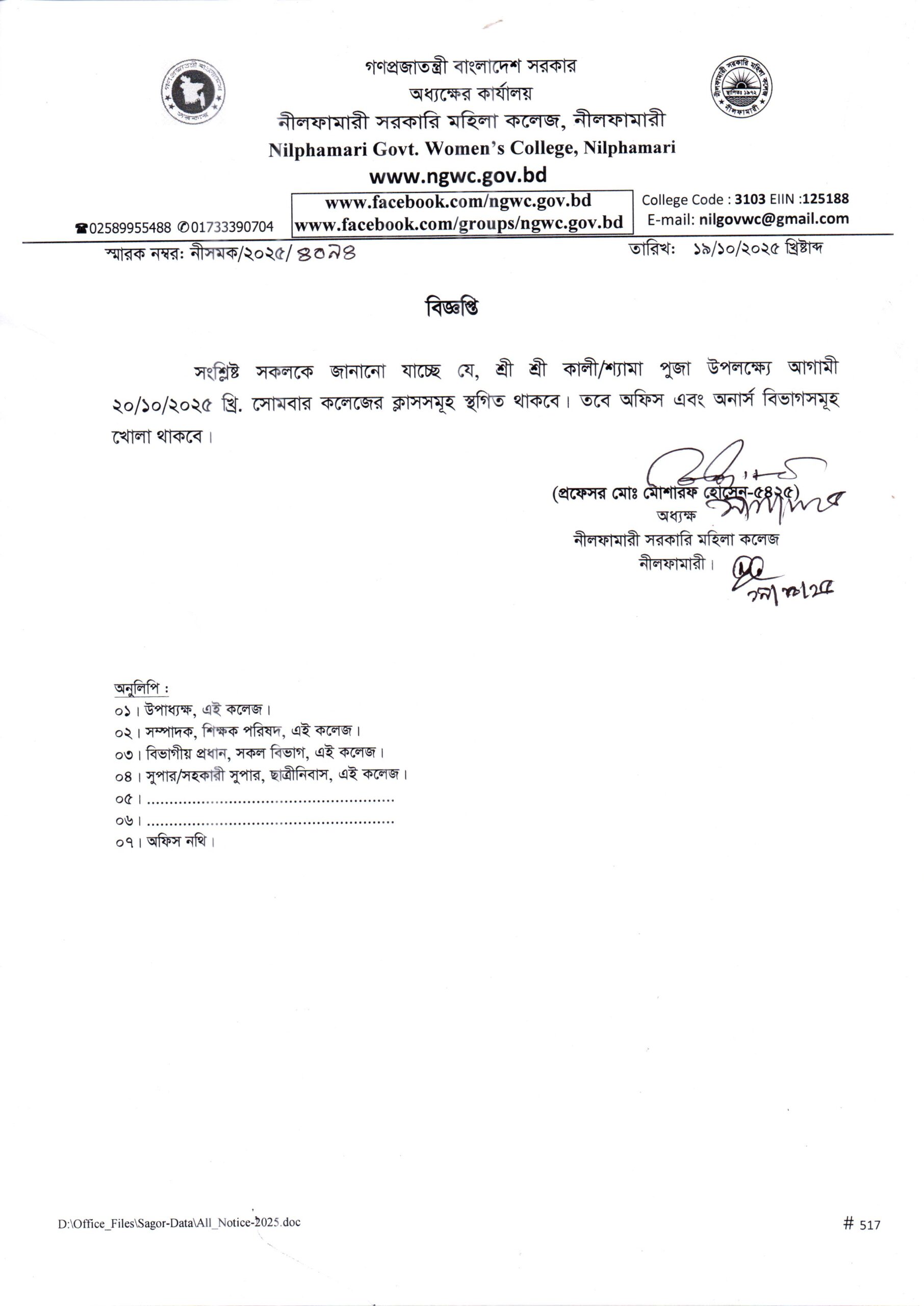 **শ্রী শ্রী কালী/শ্যামা পুজা উপলক্ষ্যে আগামী ২০/১০/২০২৫ খ্রি. সোমবার কলেজের ক্লাসসমূহ স্থগিত থাকবে**