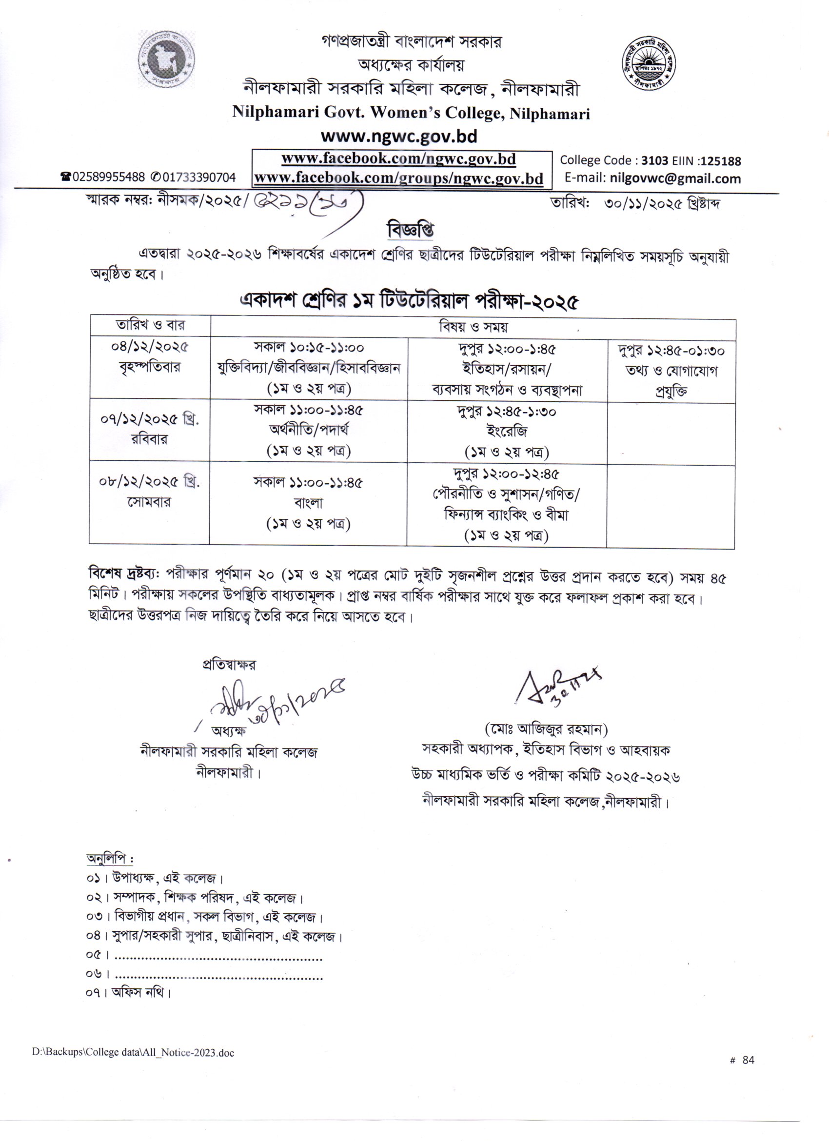 **(সংশোধিত) ২০২৫-০২৬ শিক্ষাবর্ষেরএকাদশ শ্রেণির ১ম টিউটেরিয়াল পরীক্ষার সময়সূচি**