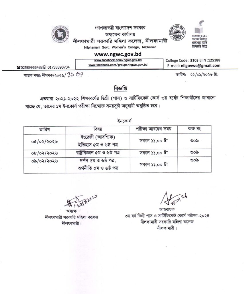২০২১-২০২২ শিক্ষাবর্ষের ডিগ্রী (পাস) ৩য় বর্ষের ১ম ইনকোর্স পরীক্ষার সময়সূচি।