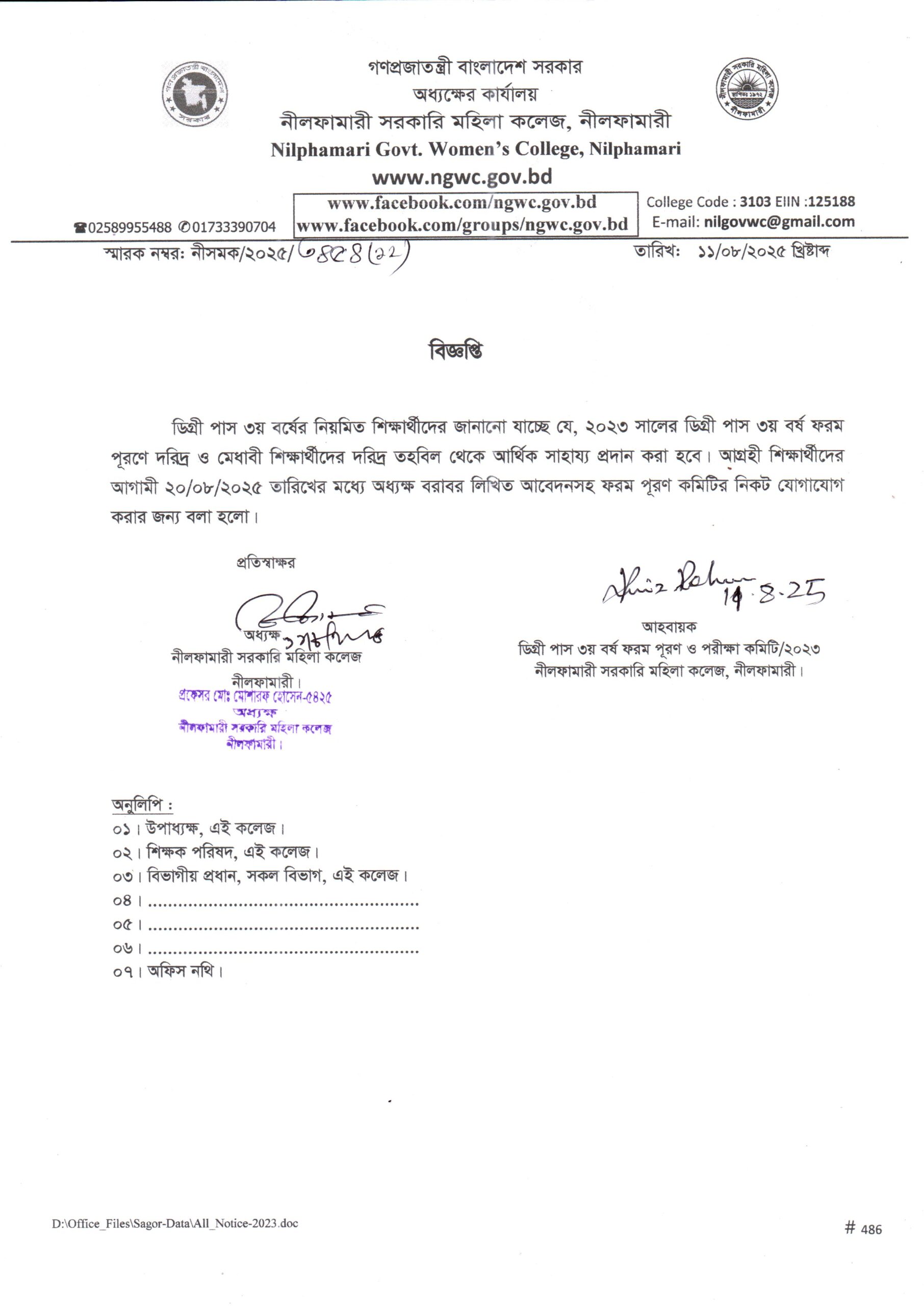 **২০২৩ সালের ডিগ্রী ৩য় বর্ষের নিয়মিত ও মেধাবী শিক্ষার্থীদের ফরম পূরণে দরিদ্র তহবিল হতে আর্থিক সহায়তা**
