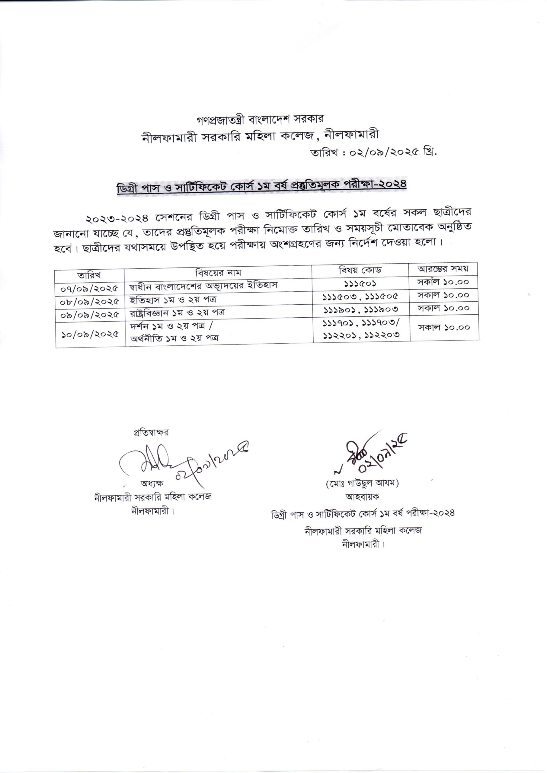 **২০২৩-২০২৪ সেশনের ডিগ্রী পাস ও সার্টিফিকেট কোর্স ১ম বর্ষের প্রস্তুতিমূলক পরীক্ষার সময়সূচী**