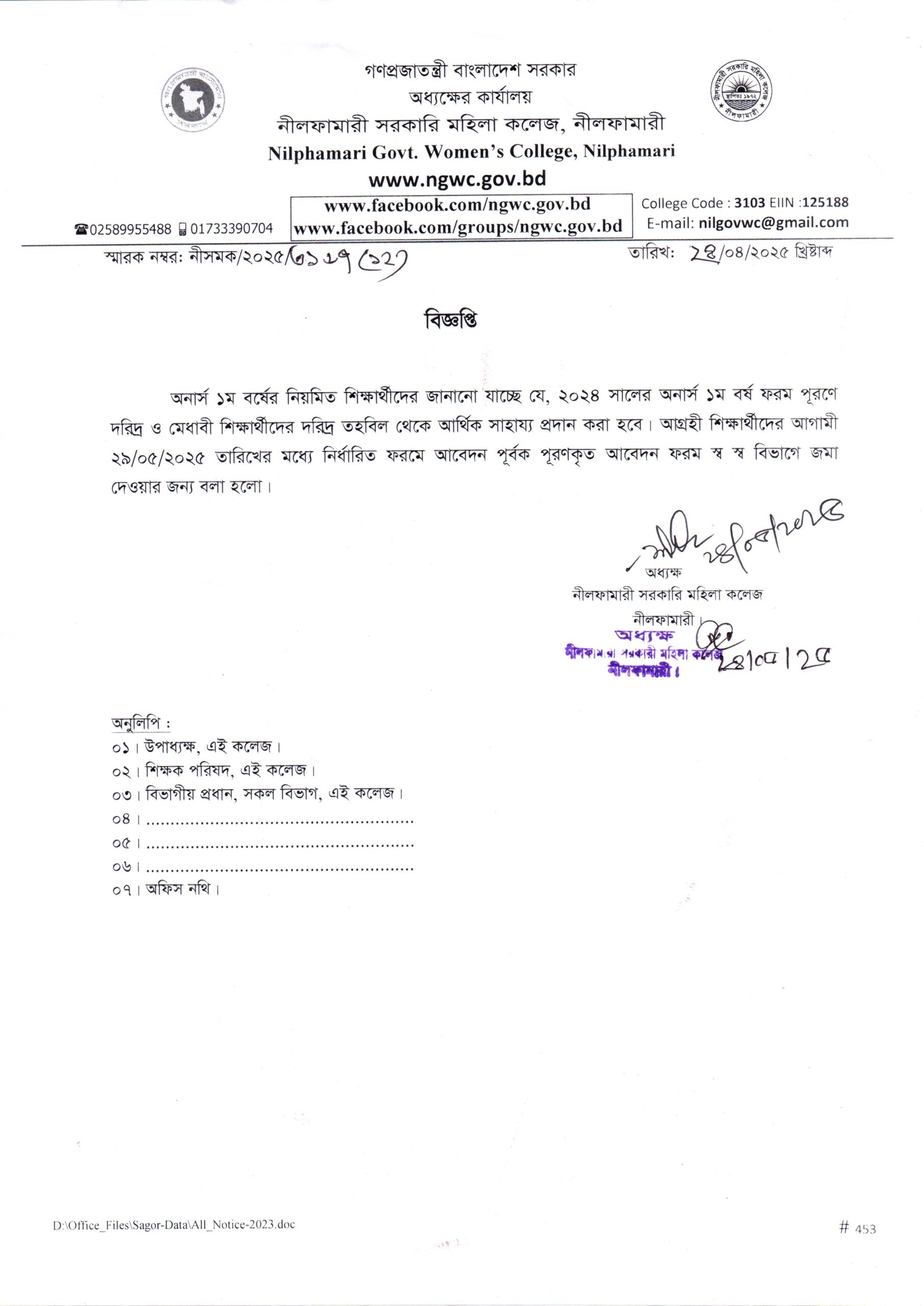 ২০২৪ সালের অনার্স ১ম বর্ষ ফরম পূরণে দরিদ্র ও মেধাবী শিক্ষার্থীদের দরিদ্র তহবিল হতে আর্থিক সহয়তা