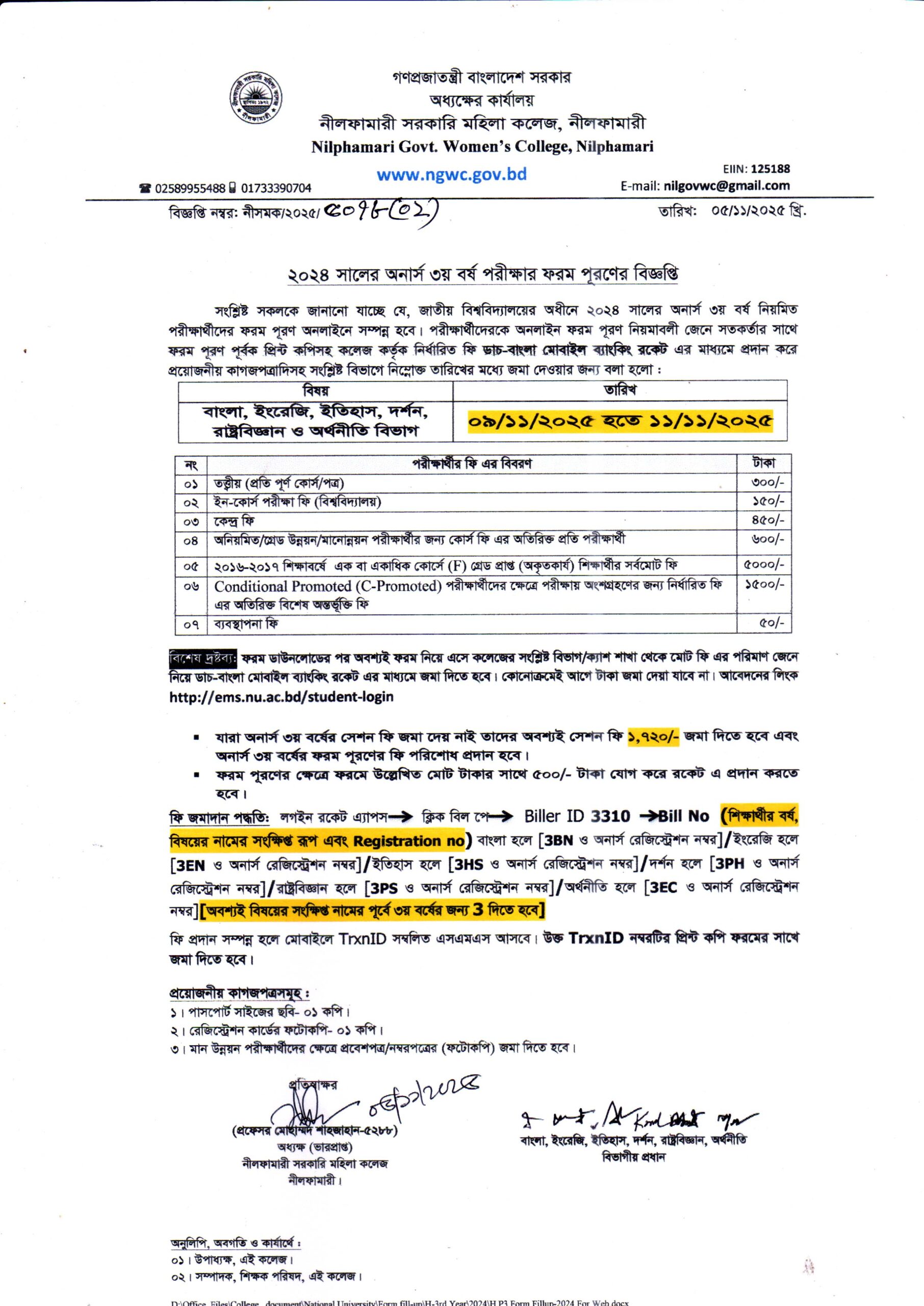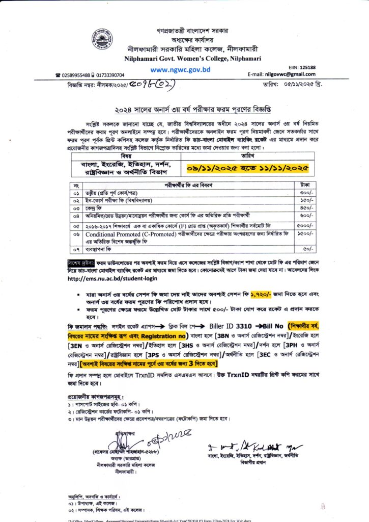 ২০২৪ সালের অনার্স ৩য় বর্ষ পরীক্ষার ফরম পূরণের বিজ্ঞপ্তি