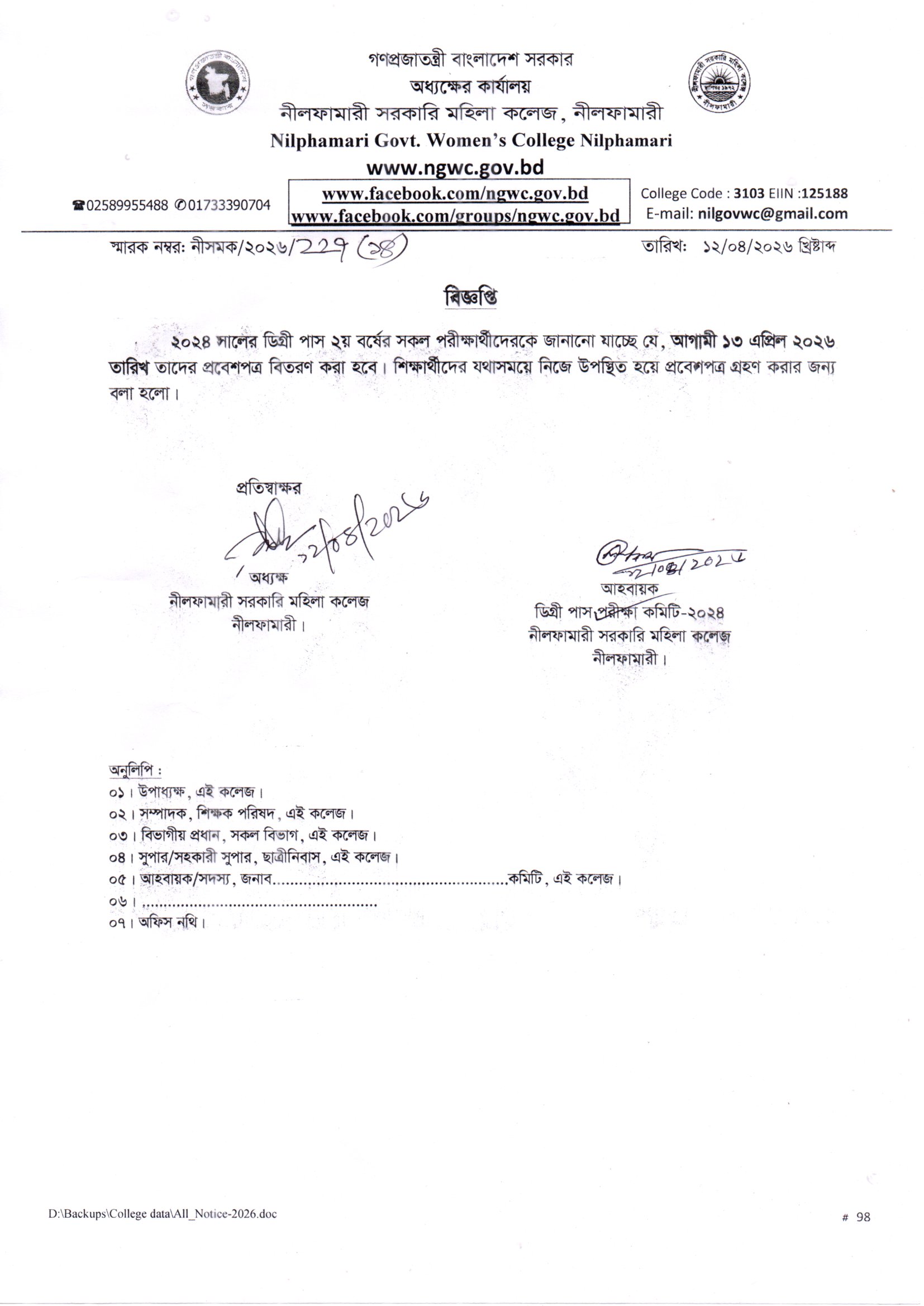 **২০২৪ সালের ডিগ্রী পাস ২য় বর্ষের পরীক্ষার্থীদের আগামী ১৩ এপ্রিল ২০২৬ তারিখ তাদের প্রবেশপত্র বিতরণ করা হবে**