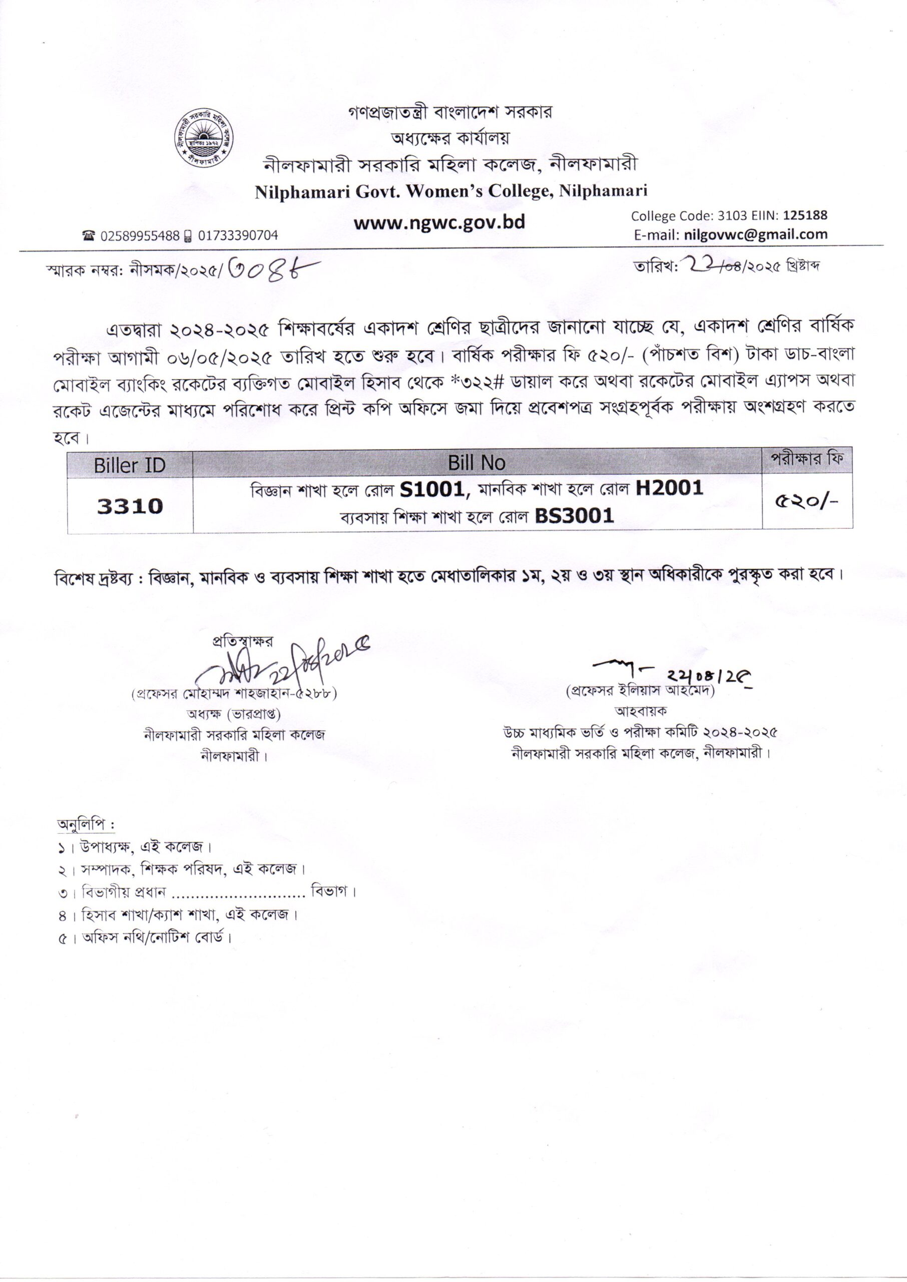 ২০২৪-২০২৫ শিক্ষাবর্ষের একাদশ শ্রেণির বার্ষিক পরীক্ষার ফি জমাদান সংক্রান্ত