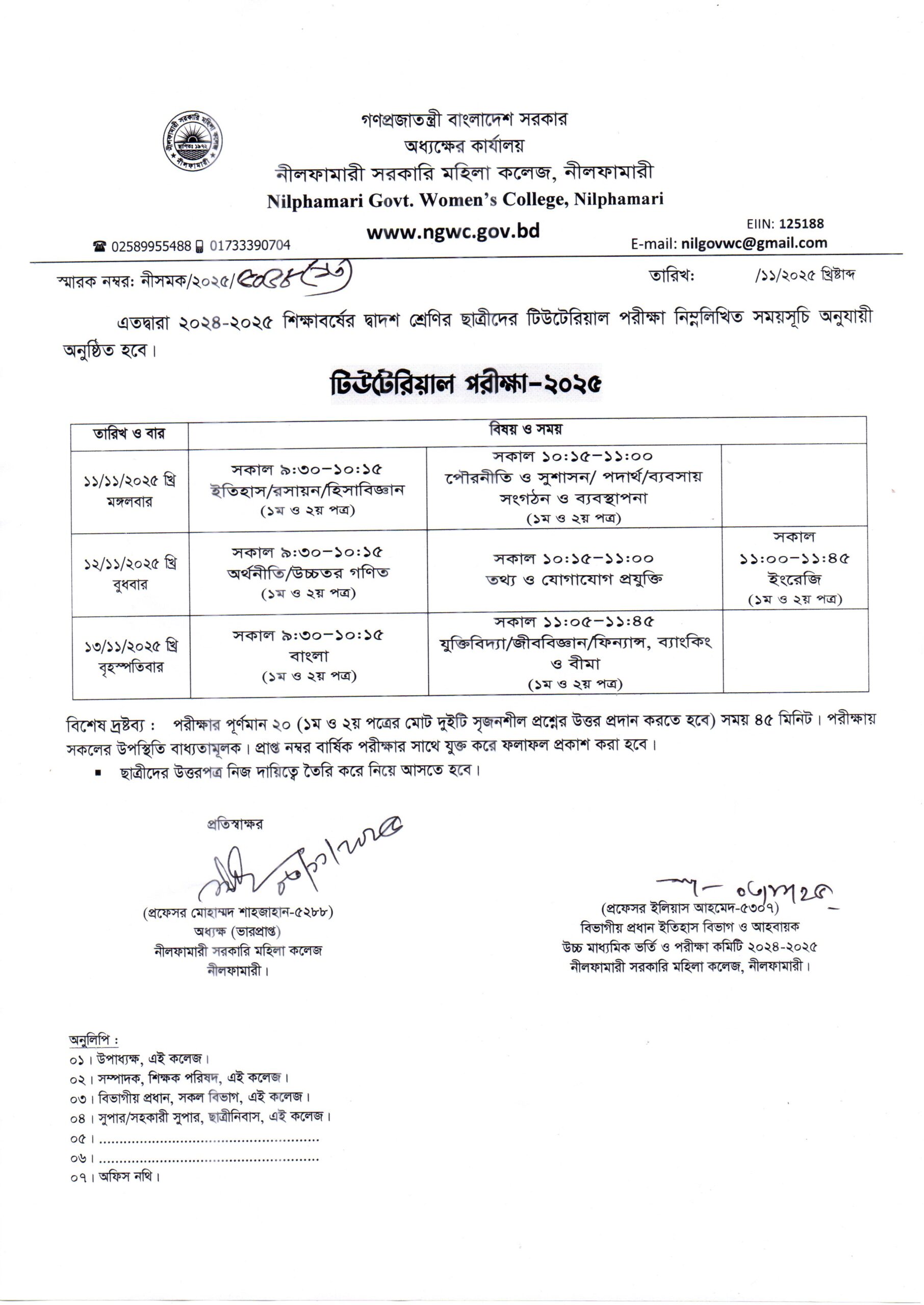 **২০২৪-২০২৫ শিক্ষাবর্ষের দ্বাদশ শ্রেণির ছাত্রীদের টিউটেরিয়াল পরীক্ষা নিম্নলিখিত সময়সূচি অনুযায়ী অনুষ্ঠিত হবে**