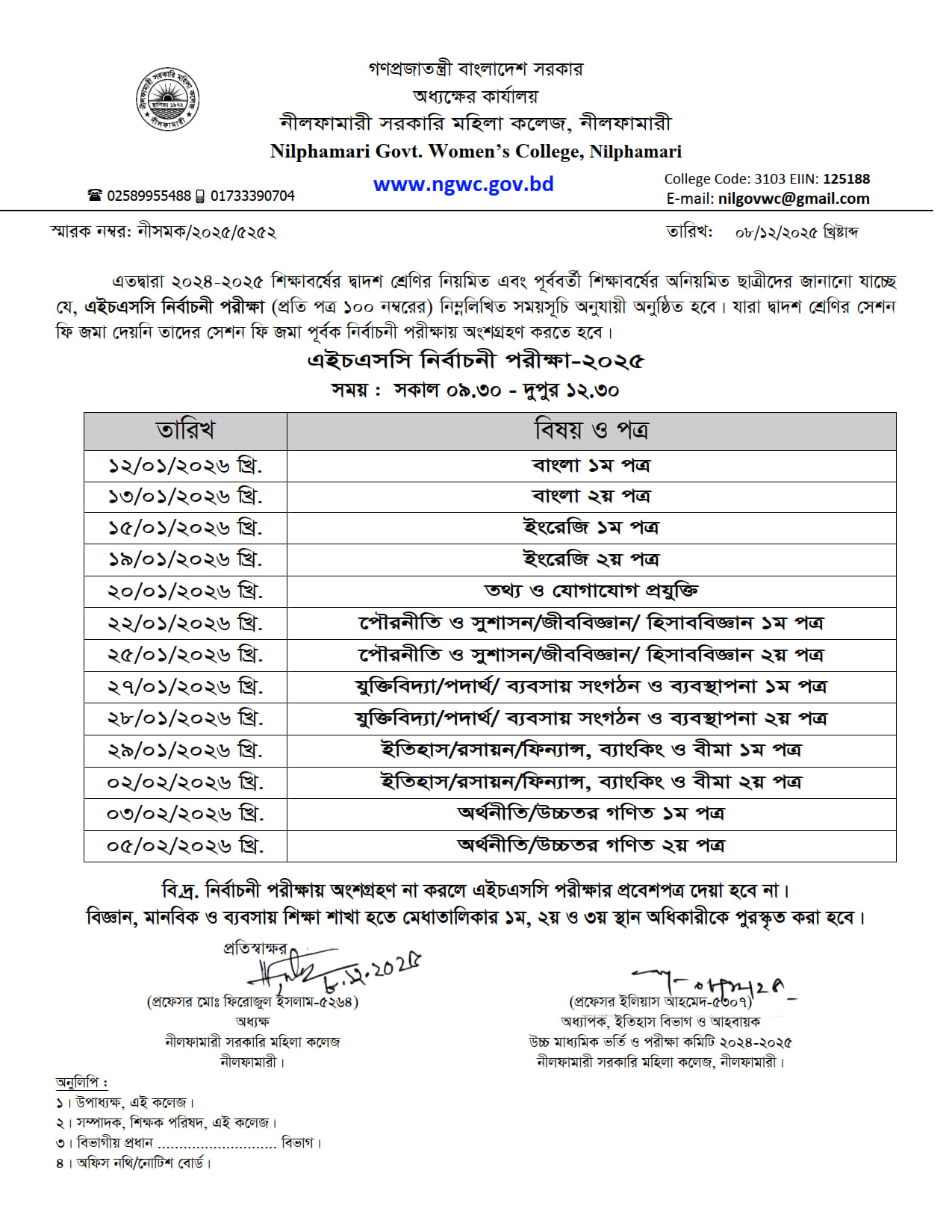 **২০২৪-২০২৫ শিক্ষাবর্ষের দ্বাদশ শ্রেণির নিয়মিত এবং পূর্ববর্তী শিক্ষাবর্ষের অনিয়মিত ছাত্রীদের এইচএসসি নির্বাচনী পরীক্ষার সময়সূচি**