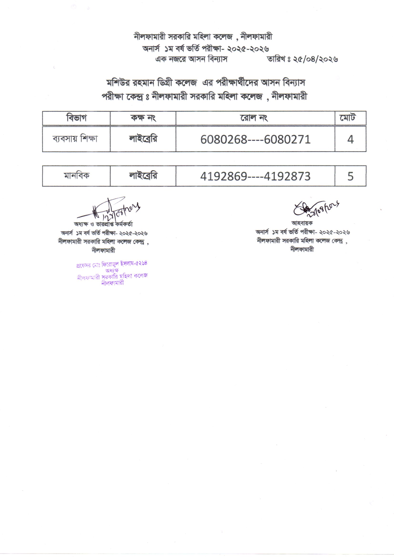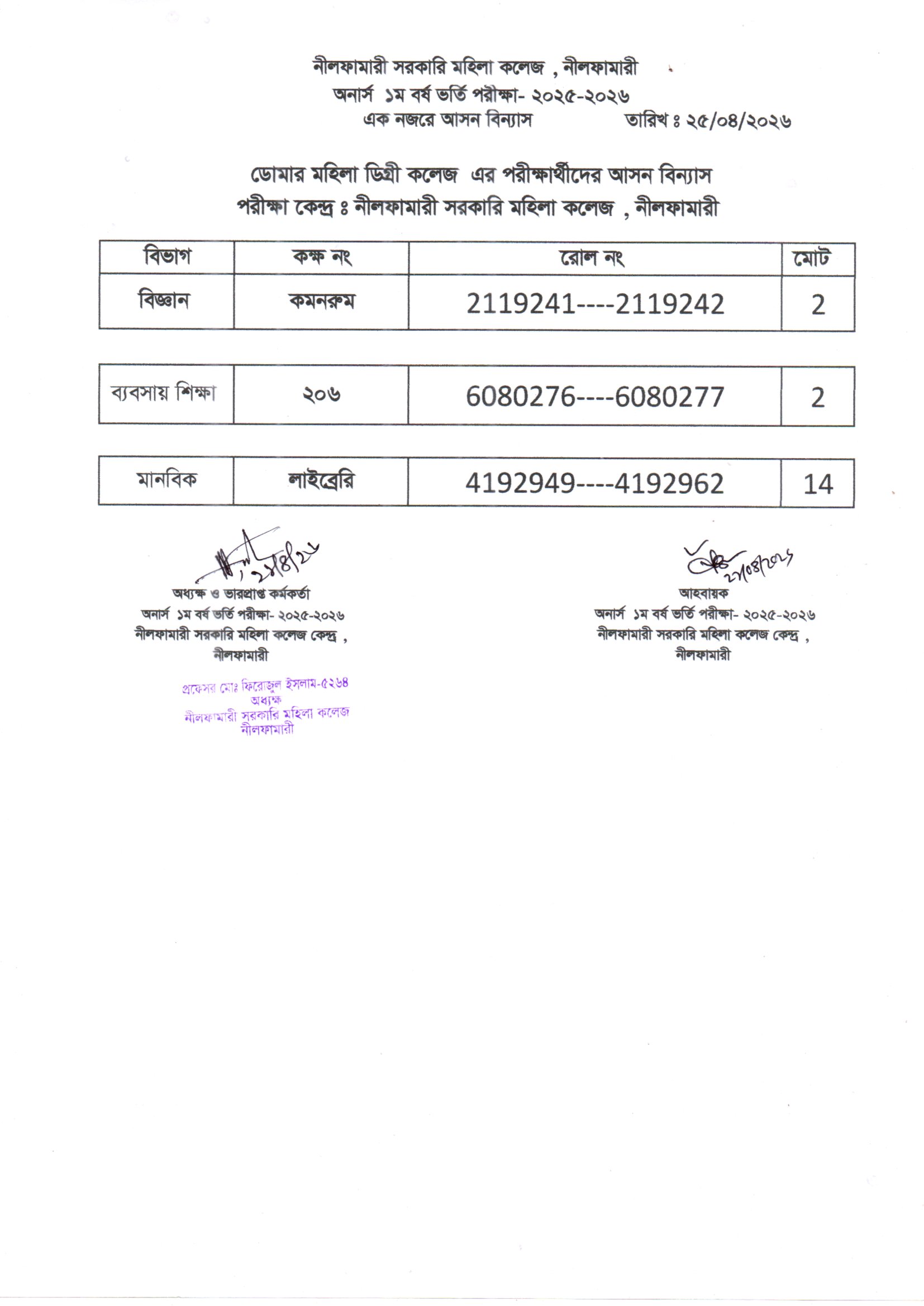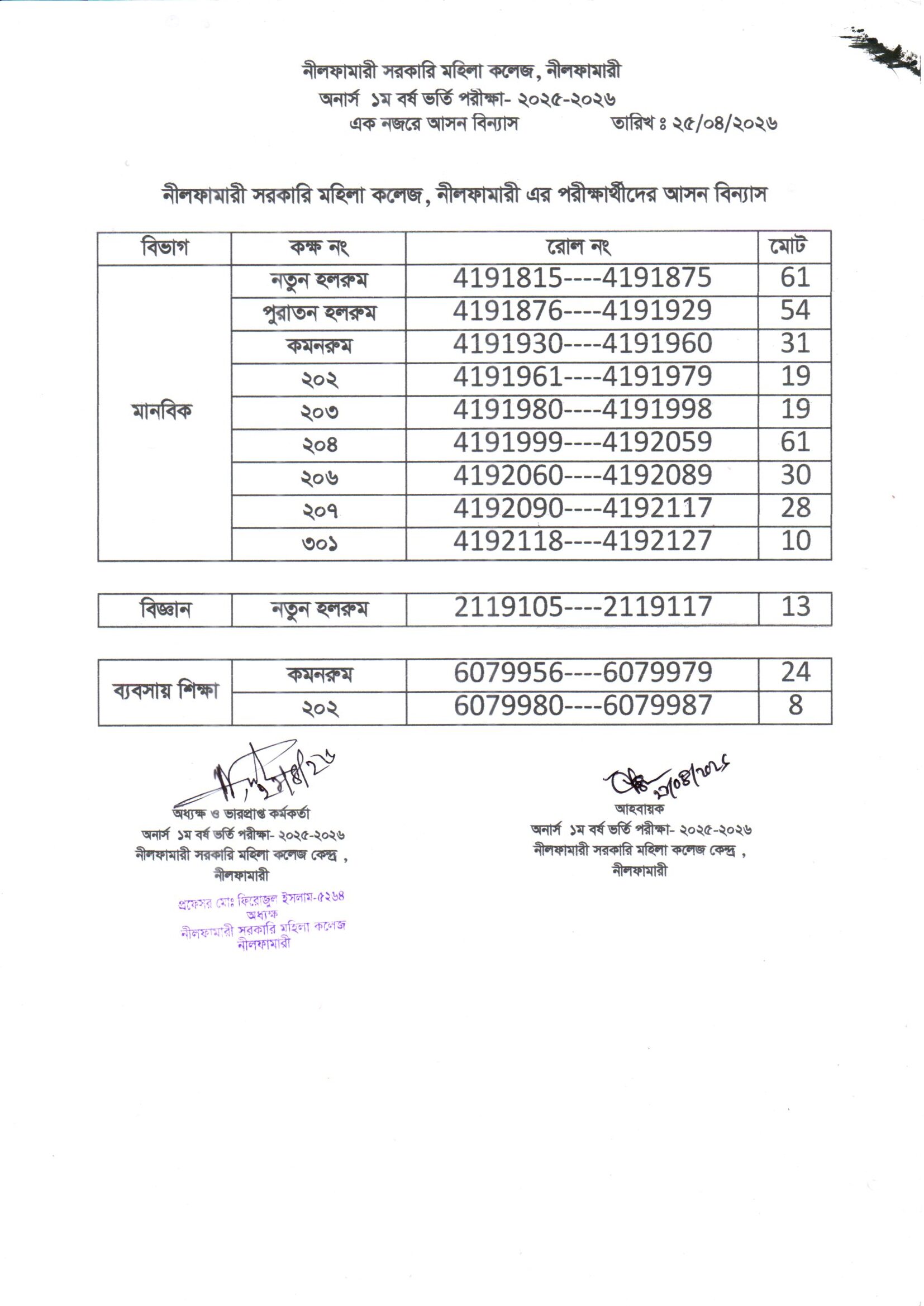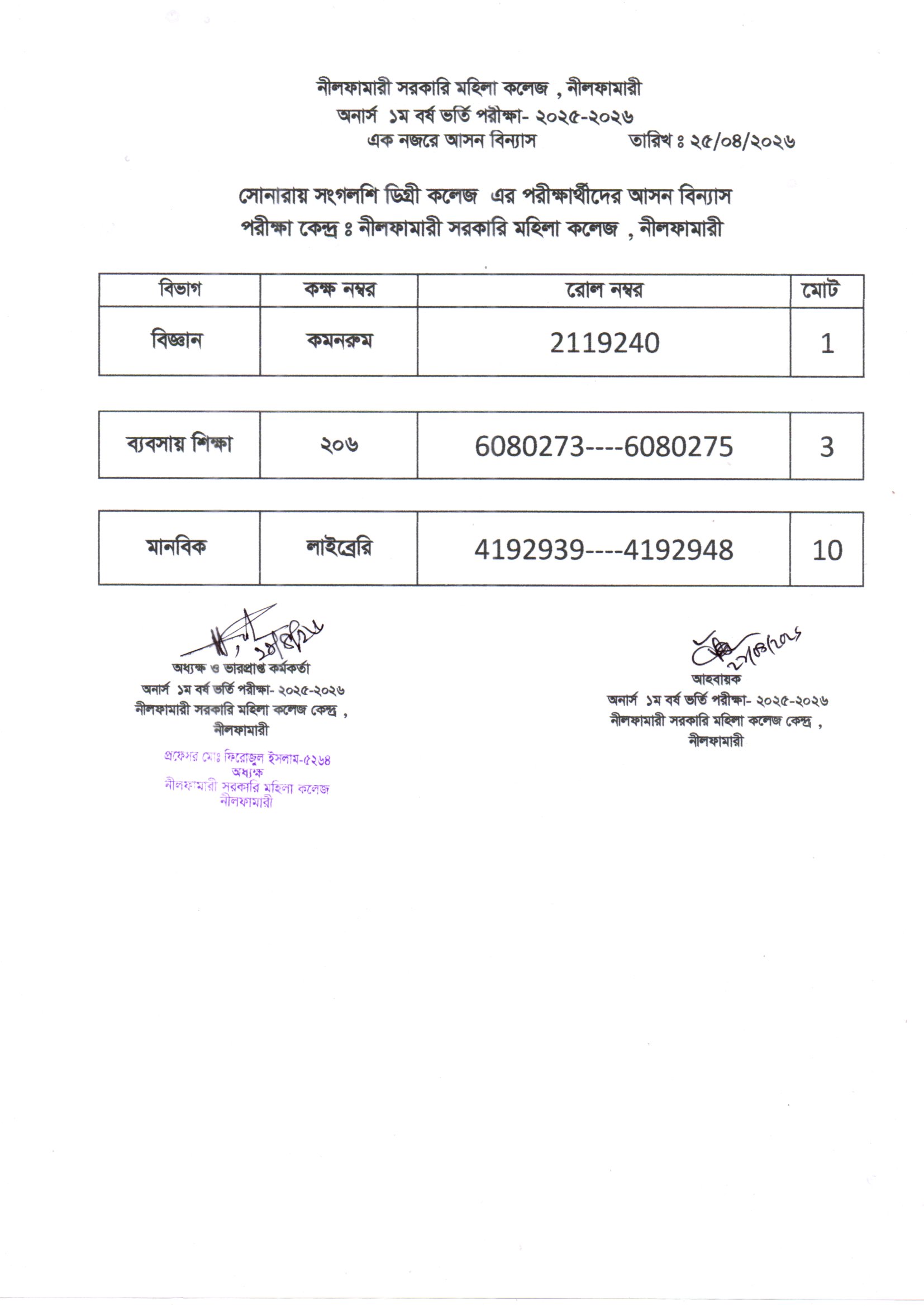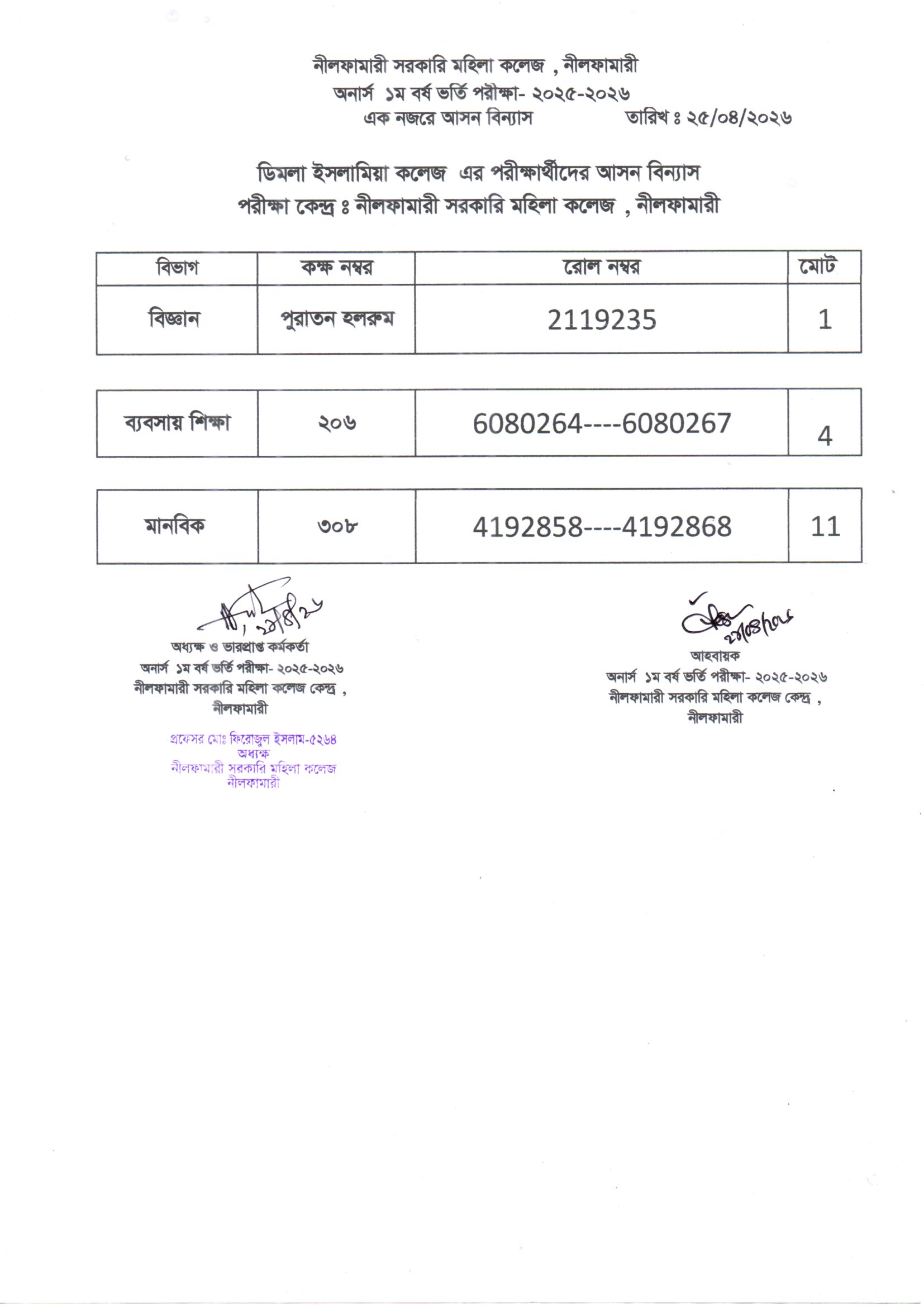 **২০২৫-২০২৬ শিক্ষাবর্ষের অনার্স ১ম বর্ষ ভর্তি পরীক্ষা নীলফামারী সরকারি মহিলা কলেজ কেন্দ্রের এক নজরে আসন বিন্যাস**