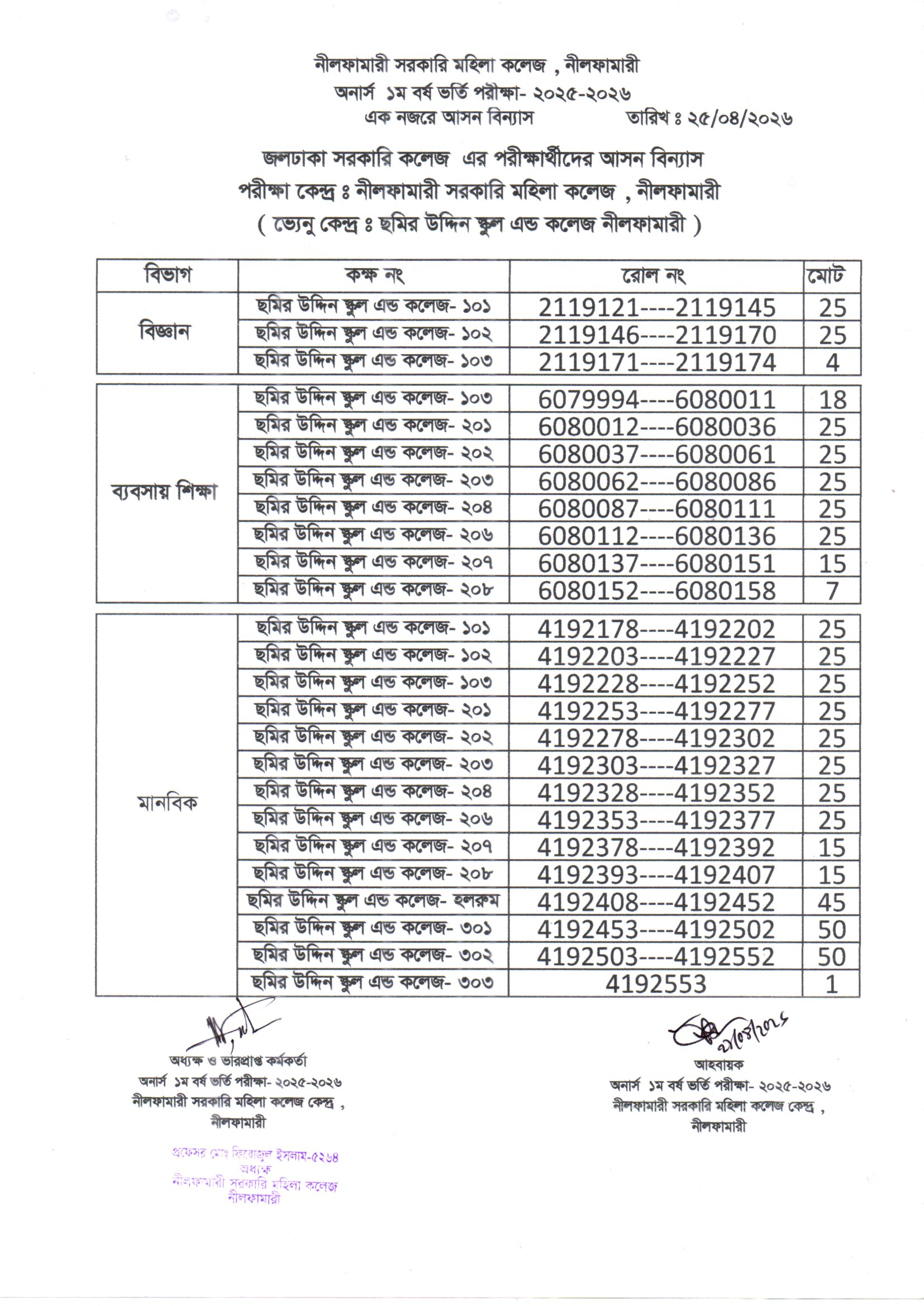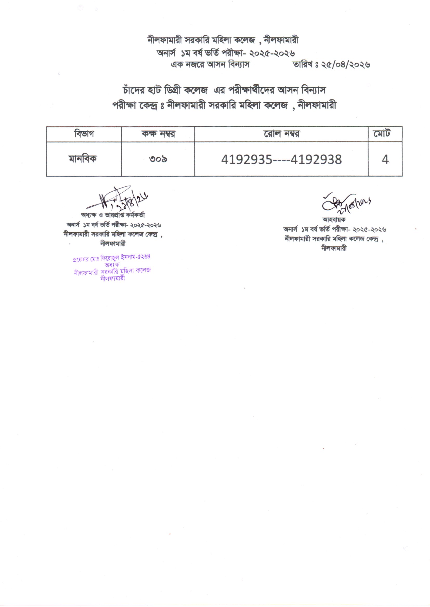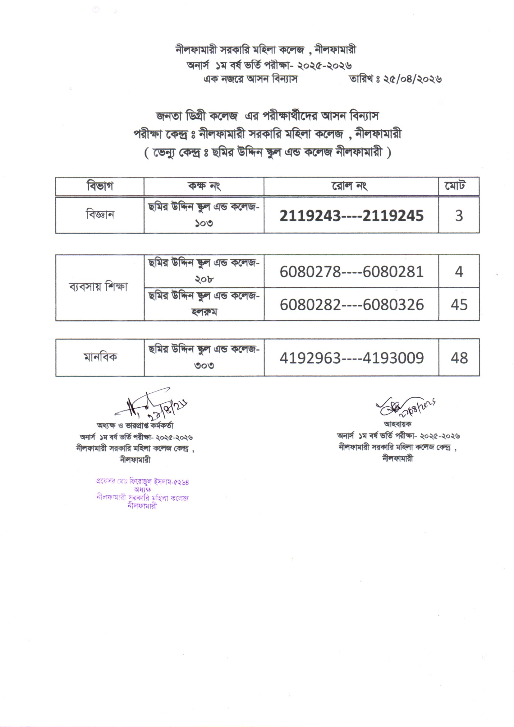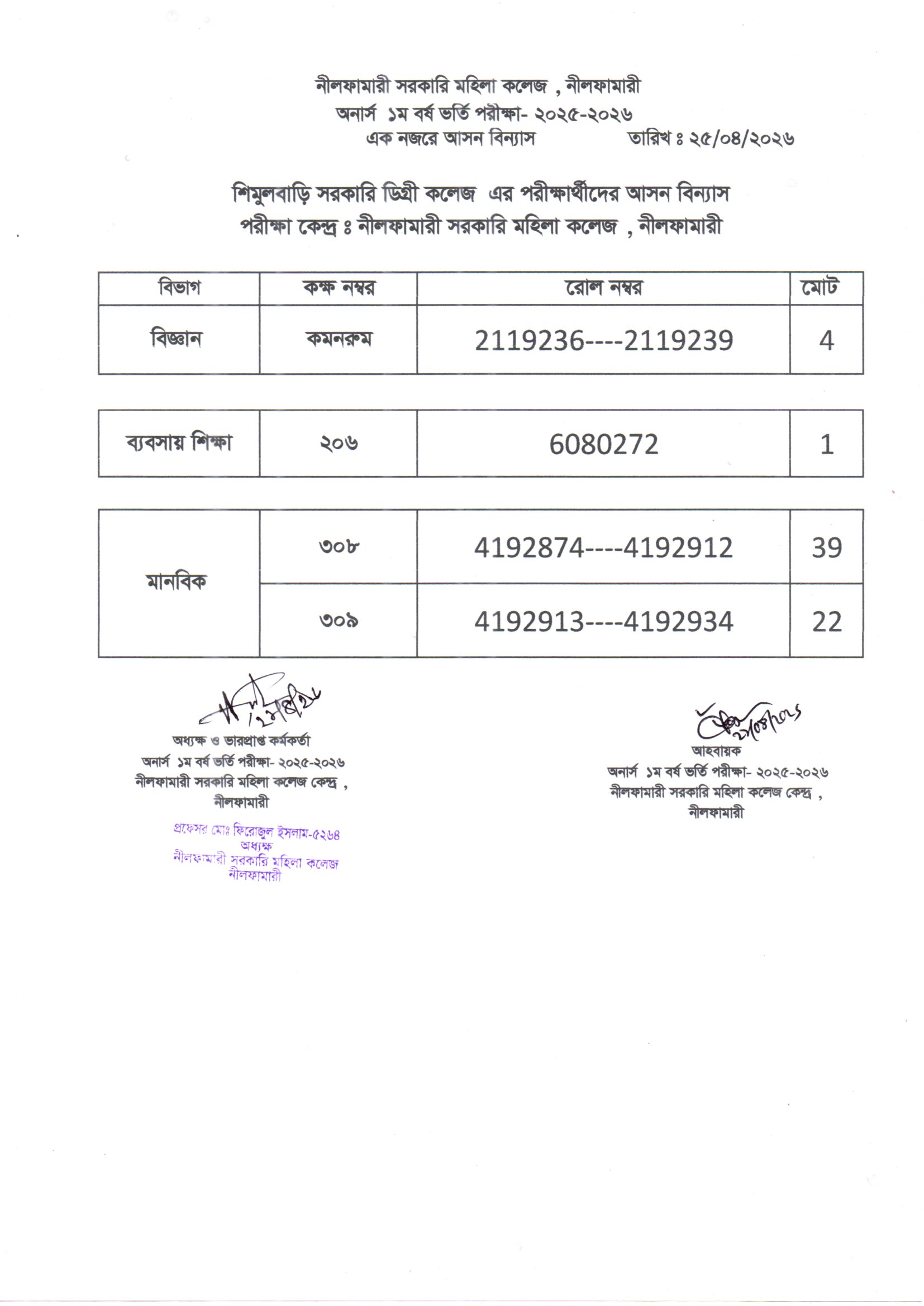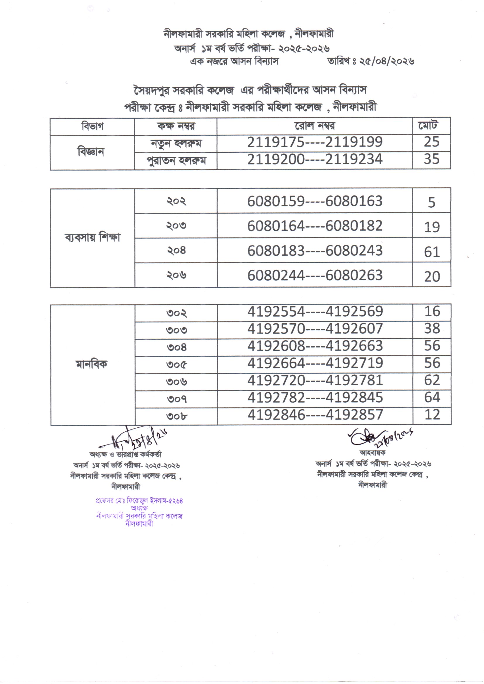 **২০২৫-২০২৬ শিক্ষাবর্ষের অনার্স ১ম বর্ষ ভর্তি পরীক্ষা নীলফামারী সরকারি মহিলা কলেজ কেন্দ্রের এক নজরে আসন বিন্যাস**