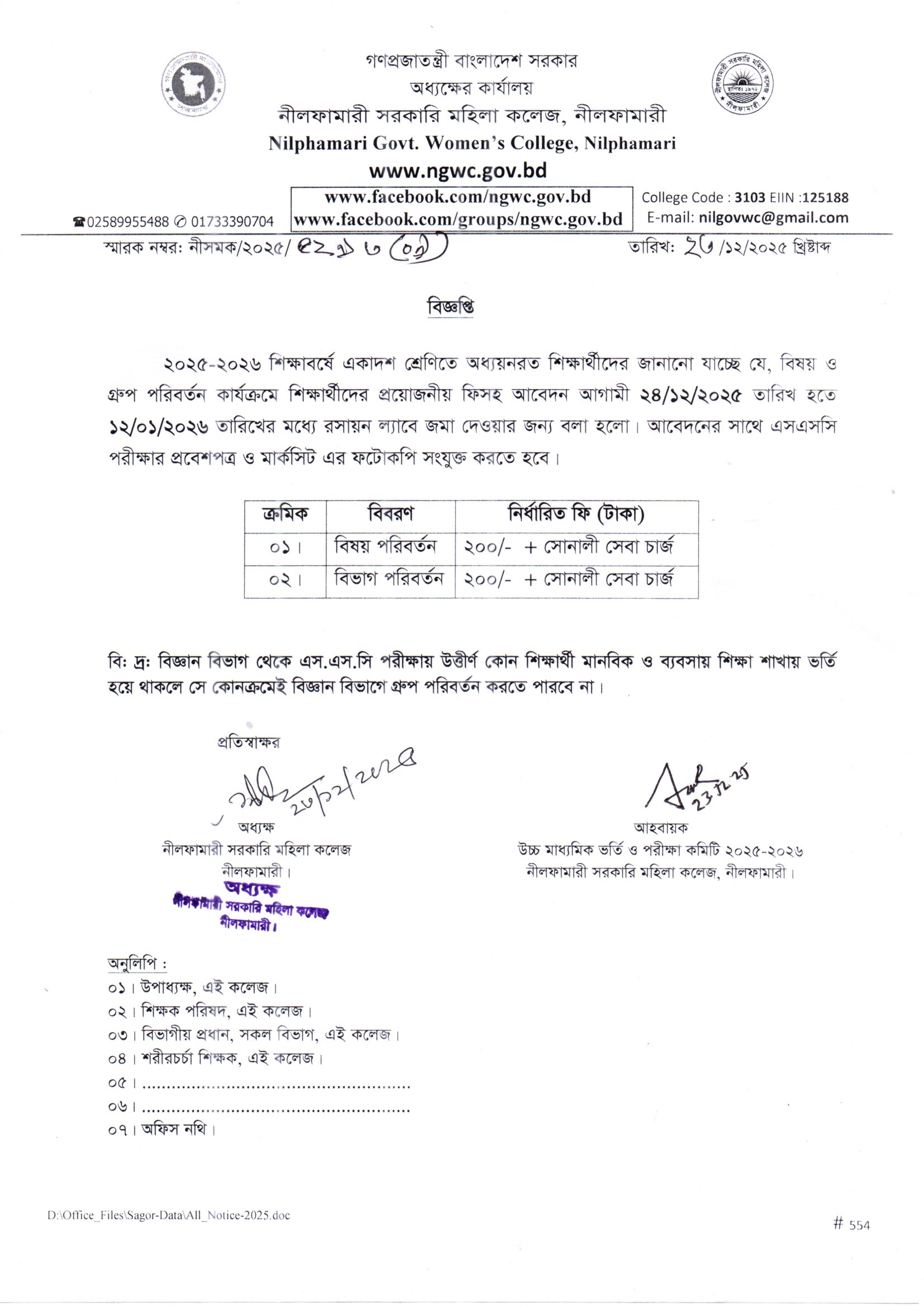 **২০২৫-২০২৬ শিক্ষাবর্ষে একাদশ শ্রেণিতে অধ্যয়নরত শিক্ষার্থীদের বিষয় ও গ্রুপ পরিবর্তন**