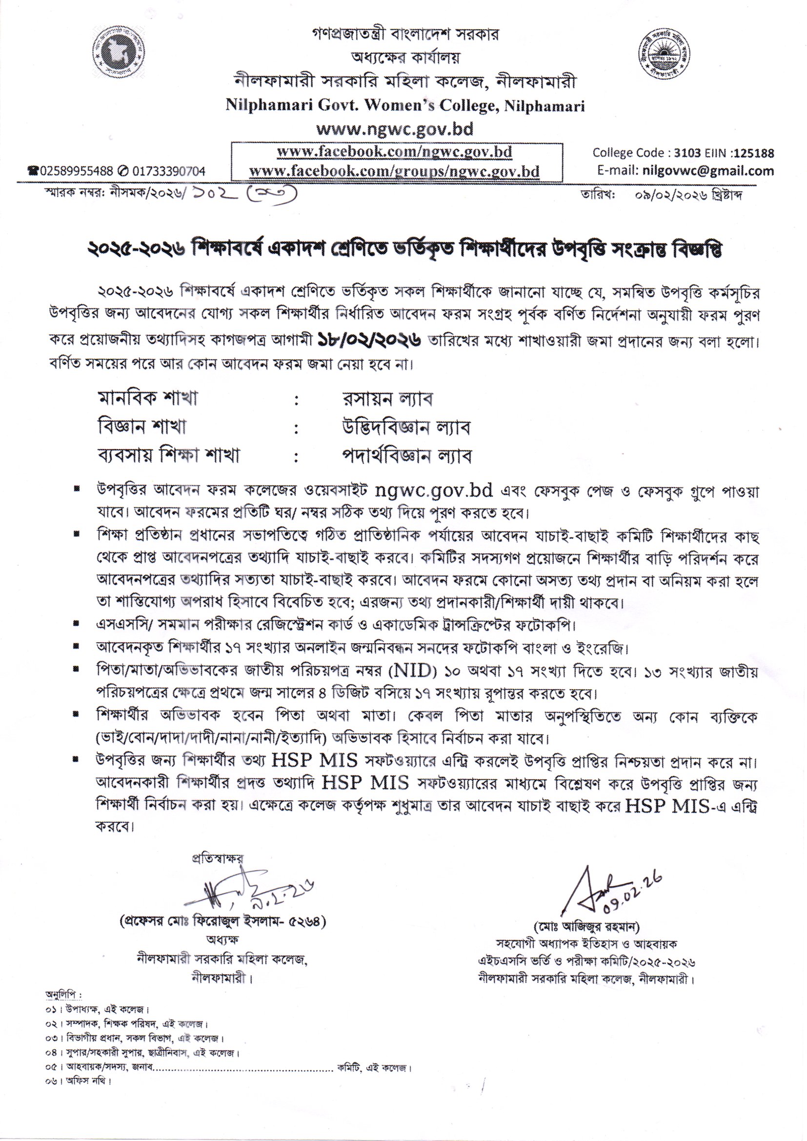 **২০২৫-২০২৬ শিক্ষাবর্ষে একাদশ শ্রেণিতে ভর্তিকৃত শিক্ষার্থীদের সমন্বিত উপবৃত্তি সংক্রান্ত বিজ্ঞপ্তি**